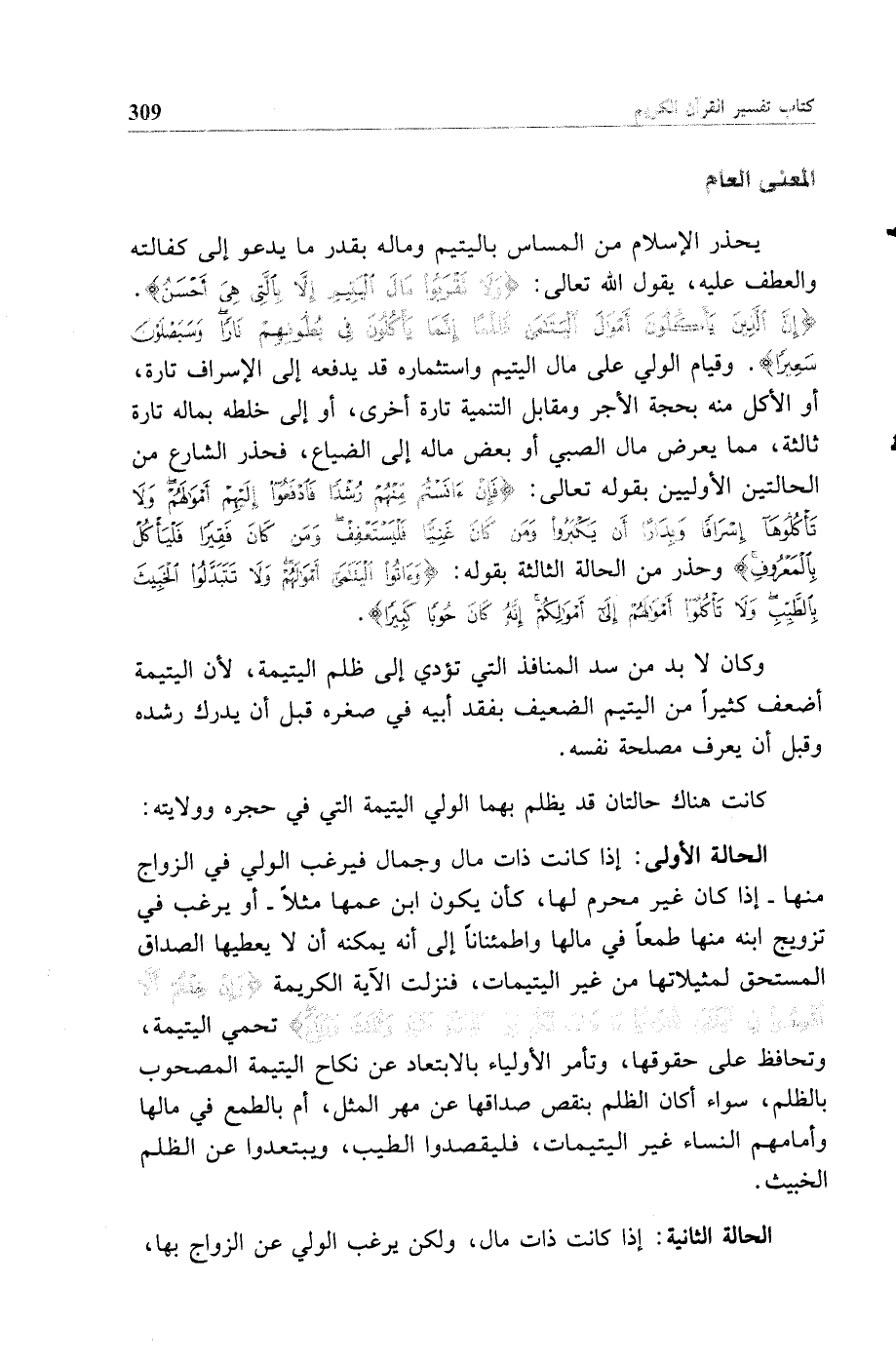 الحالة الأولى إذا كانت ذات مال وجمال فيرغب الولي في الزواج منها إذا كان غير محرم لها كأن يكون ابن عمها مثلا أو يرغب في تزويج ابنه منها طمعا في مالها واطمئنانا إلى أنه يمكنه أن لا يعطيها الصداق المستحق لمثيلاتها من غير اليتيمات فنزلت الآية الكريمة {وإن خفتم ألا تقسطوا في اليتامى فانكحوا ما طاب لكم من النساء مثنى وثلاث ورباع} تحمي اليتيمة وتحافظ على حقوقها وتأمر الأولياء بالابتعاد عن نكاح اليتيمة المصحوب بالظلم سواء أكان الظلم بنقص صداقها عن مهر المثل أم بالطمع في مالها وأمامهم النساء غير اليتيمات فليقصدوا الطيب ويبتعدوا عن الظلم الخبيث