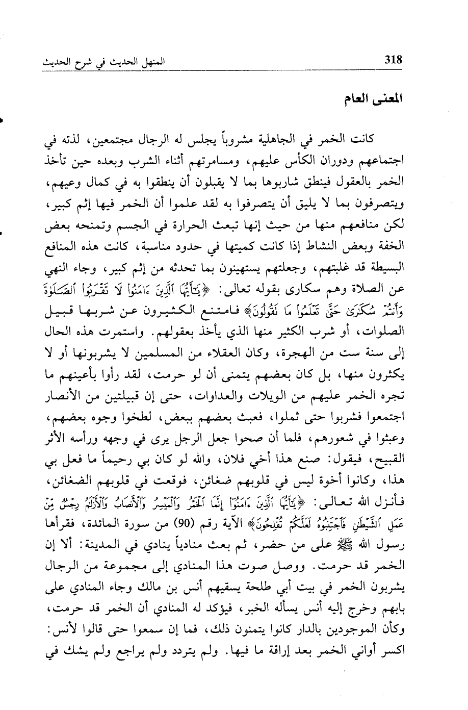 كانت الخمر في الجاهلية مشروبا يجلس له الرجال مجتمعين لذته في اجتماعهم ودوران الكأس عليهم ومسامرتهم أثناء الشرب وبعده حين تأخذ الخمر بالعقول فينطق شاربوها بما لا يقبلون أن ينطقوا به في كمال وعيهم ويتصرفون بما لا يليق أن يتصرفوا به لقد علموا أن الخمر فيها إثم كبير لكن منافعهم منها من حيث إنها تبعث الحرارة في الجسم وتمنحه بعض الخفة وبعض النشاط إذا كانت كميتها في حدود مناسبة كانت هذه المنافع البسيطة قد غلبتهم وجعلتهم يستهينون بما تحدثه من إثم كبير وجاء النهي عن الصلاة وهم سكارى بقوله تعالى {يا أيها الذين آمنوا لا تقربوا الصلاة وأنتم سكارى حتى تعلموا ما تقولون} فامتنع الكثيرون عن شربها قبيل الصلوات أو شرب الكثير منها الذي يأخذ بعقولهم واستمرت هذه الحال إلى سنة ست من الهجرة وكان العقلاء من المسلمين لا يشربونها أو لا يكثرون منها بل كان بعضهم يتمنى أن لو حرمت لقد رأوا بأعينهم ما تجره الخمر عليهم من الويلات والعداوات حتى إن قبيلتين من الأنصار اجتمعوا فشربوا حتى ثملوا فعبث بعضهم ببعض لطخوا وجوه بعضهم وعبثوا في شعورهم فلما أن صحوا جعل الرجل يرى في وجهه ورأسه الأثر القبيح فيقول صنع هذا أخي فلان والله لو كان بي رحيما ما فعل بي هذا وكانوا أخوة ليس في قلوبهم ضغائن فوقعت في قلوبهم الضغائن فأنزل الله تعالى {يا أيها الذين آمنوا إنما الخمر والميسر والأنصاب والأزلام رجس من عمل الشيطان فاجتنبوه لعلكم تفلحون} الآية رقم 90 من سورة المائدة فقرأها رسول الله صلى الله عليه وسلم على من حضر ثم بعث مناديا ينادي في المدينة ألا إن الخمر قد حرمت ووصل صوت هذا المنادي إلى مجموعة من الرجال يشربون الخمر في بيت أبي طلحة يسقيهم أنس بن مالك وجاء المنادي على بابهم وخرج إليه أنس يسأله الخبر فيؤكد له المنادي أن الخمر قد حرمت وكأن الموجودين بالدار كانوا يتمنون ذلك فما إن سمعوا حتى قالوا لأنس اكسر أواني الخمر بعد