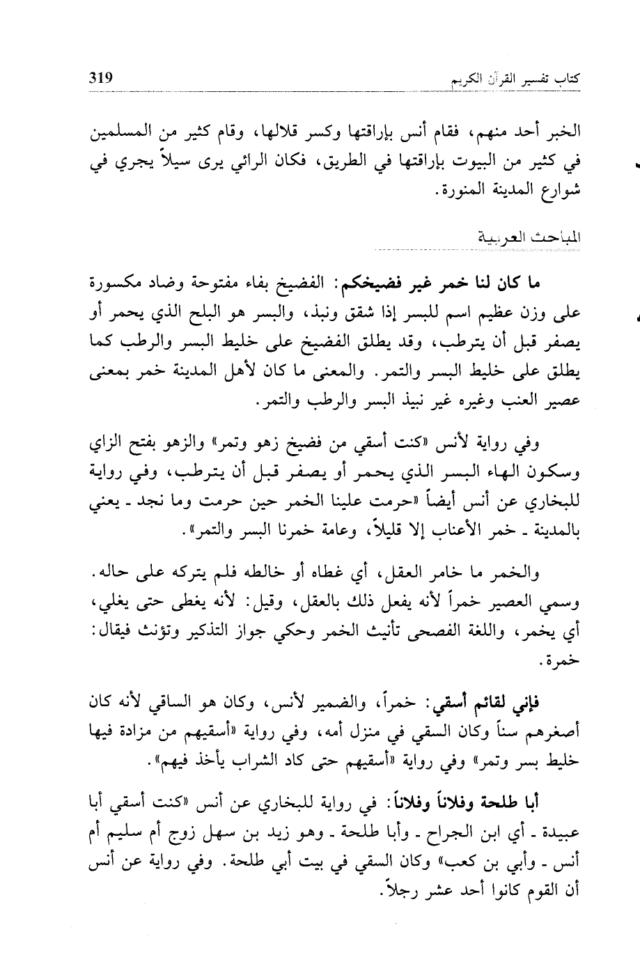 (ما كان لنا خمر غير فضيخكم) الفضيخ بفاء مفتوحة وضاد مكسورة على وزن عظيم اسم للبسر إذا شقق ونبذ والبسر هو البلح الذي يحمر أو يصفر قبل أن يترطب وقد يطلق الفضيخ على خليط البسر والرطب كما يطلق على خليط البسر والتمر والمعنى ما كان لأهل المدينة خمر بمعنى عصير العنب وغيره غير نبيذ البسر والرطب والتمر