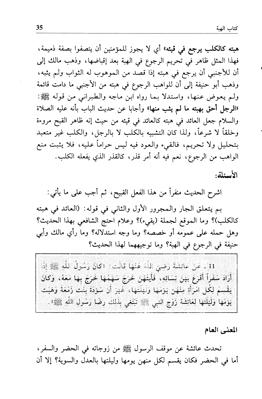 هبته كالكلب يرجع في قيئه) أي لا يجوز للمؤمنين أن يتصفوا بصفة ذميمة فهذا المثل ظاهر في تحريم الرجوع في الهبة بعد إقباضها وذهب مالك إلى أن للأجنبي أن يرجع في هبته إذا قصد من الموهوب له الثواب ولم يثبه وذهب أبو حنيفة إلى أن للواهب الرجوع في هبته من الأجنبي ما دامت قائمة ولم يعوض عنها واستدلا بما رواه ابن ماجه والطبراني من قوله صلى الله عليه وسلم (الرجل أحق بهبته ما لم يثب منها) وأجابا عن حديث الباب بأنه عليه الصلاة والسلام جعل العائد في هبته كالعائد في قيئه من حيث إنه ظاهر القبح مروءة وخلقا لا شرعا ولذا كان التشبيه بالكلب لا بالرجل والكلب غير متعبد بتحليل ولا تحريم فالقيء والعود فيه ليس حراما عليه فلا يثبت منع الواهب من الرجوع نعم فيه أنه أمر قذر كالقذر الذي يفعله الكلب