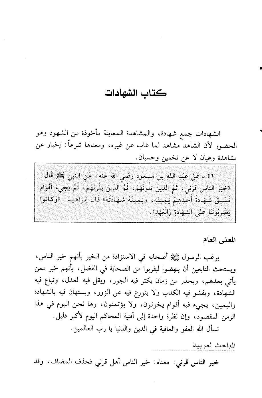 13 - عن عبد الله بن مسعود رضي الله عنه عن النبي صلى الله عليه وسلم قال: -"خير الناس قرني ثم الذين يلونهم ثم الذين يلونهم ثم يجيء أقوام تسبق شهادة أحدهم يمينه ويمينه شهادته" قال إبراهيم وكانوا يضربوننا على الشهادة والعهد"