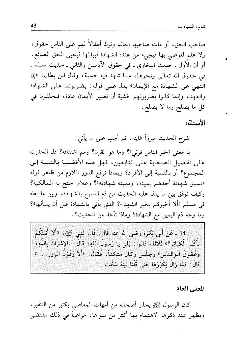 14 - عن أبي بكرة رضي الله عنه قال قال النبي صلى الله عليه وسلم ألا أنبئكم بأكبر الكبائر ثلاثا قالوا بلى يا رسول الله قال الإشراك بالله وعقوق الوالدين وجلس وكان متكئا فقال ألا وقول الزور .. قال فما زال يكررها حتى قلنا ليته سكت
