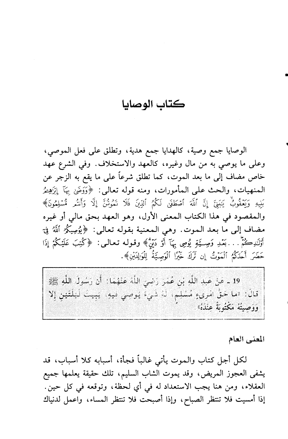 19 - عن عبد الله بن عمر رضي الله عنهما أن رسول الله صلى الله عليه وسلم قال: ما حق امرئ مسلم له شيء يوصي فيه يبيت ليلتين إلا ووصيته مكتوبة عنده