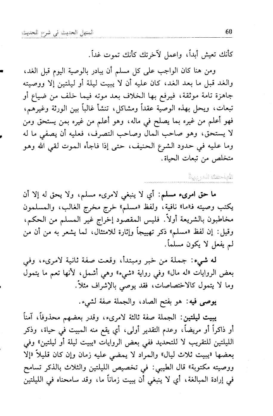 (ما حق امرئ مسلم) أي لا ينبغي لامرئ مسلم ولا يحق له إلا أن يكتب وصيته فـ "ما" نافية ولفظ مسلم خرج مخرج الغالب والمسلمون مخاطبون بالشريعة أولا فليس المقصود إخراج غير المسلم من الحكم وقيل إن لفظ مسلم ذكر تهييجا وإثارة للامتثال لما يشعر به من أن من لم يفعل لا يكون مسلما