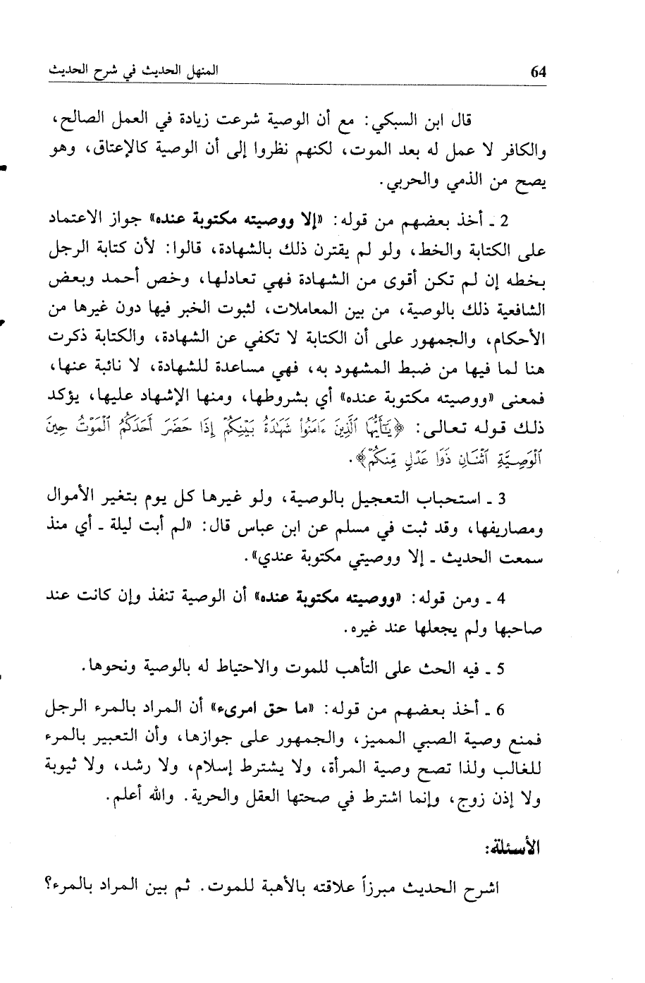3 - استحباب التعجيل بالوصية ولو غيرها كل يوم بتغير الأموال ومصاريفها وقد ثبت في مسلم عن ابن عباس قال لم أبت ليلة أي منذ سمعت الحديث إلا ووصيتي مكتوبة عندي