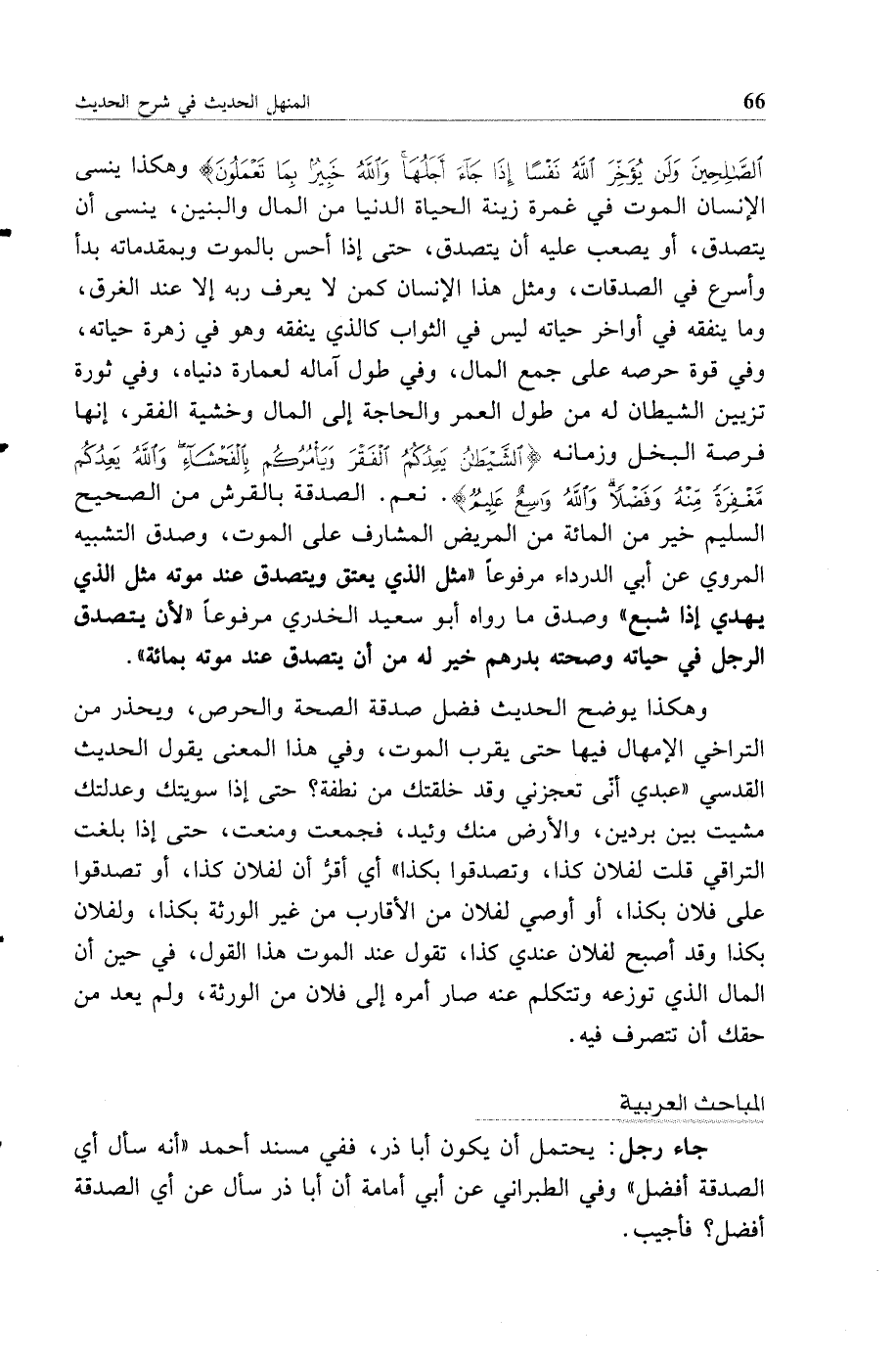 وهكذا يوضح الحديث فضل صدقة الصحة والحرص ويحذر من التراخي والإمهال فيها حتى يقرب الموت وفي هذا المعنى يقول الحديث القدسي عبدي أنى تعجزني وقد خلقتك من نطفة حتى إذا سويتك وعدلتك مشيت بين بردين وللأرض منك وئيد فجمعت ومنعت حتى إذا بلغت التراقي قلت لفلان كذا وتصدقوا بكذا أي أقر أن لفلان كذا أو تصدقوا على فلان بكذا أو أوصي لفلان من الأقارب من غير الورثة بكذا ولفلان بكذا وقد أصبح لفلان عندي كذا تقول عند الموت هذا القول في حين أن المال الذي توزعه وتتكلم عنه صار أمره إلى فلان من الورثة ولم يعد من حقك أن تتصرف فيه