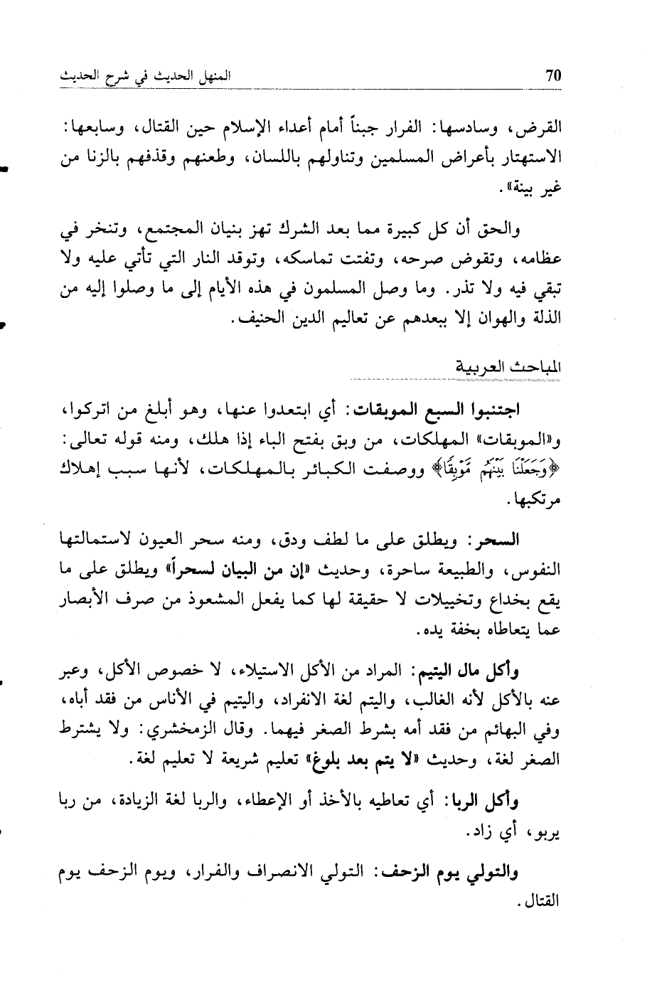 القرض وسادسها الفرار جبنا أمام أعداء الإسلام حين القتال وسابعها الاستهتار بأعراض المسلمين وتناولهم باللسان وطعنهم وقذفهم بالزنا من غير بينة