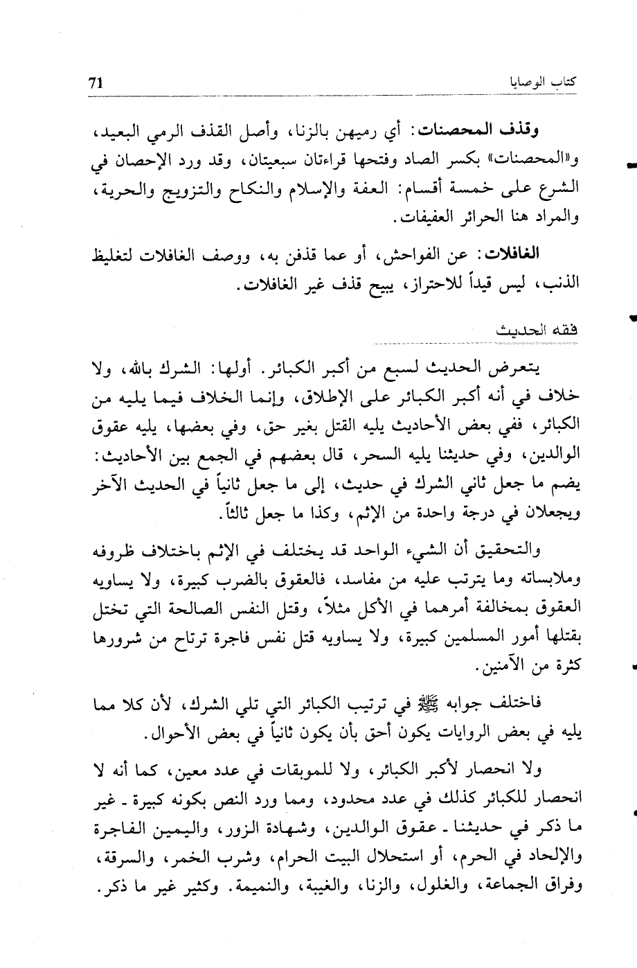 ولا انحصار لأكبر الكبائر ولا للموبقات في عدد معين كما أنه لا انحصار للكبائر كذلك في عدد محدود ومما ورد النص بكونه كبيرة غير ما ذكر في حديثنا عقوق الوالدين وشهادة الزور واليمين الفاجرة والإلحاد في الحرم أو استحلال البيت الحرام وشرب الخمر والسرقة وفراق الجماعة والغلول والزنا والغيبة والنميمة وكثير غير ما ذكر