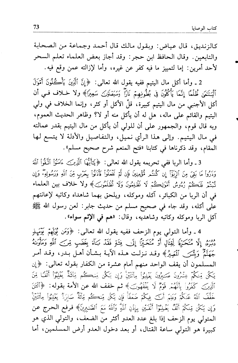 2 - وأما أكل مال اليتيم ففيه يقول الله تعالى {إن الذين يأكلون أموال اليتامى ظلما إنما يأكلون في بطونهم نارا وسيصلون سعيرا} ولا خلاف في أن أكل الأجنبي من مال اليتيم كبيرة، قل الأكل أو كثر وإنما الخلاف في ولي اليتيم والقائم على ماله هل له أن يأكل منه أو لا؟ وظاهر الحديث العموم وبه قال قوم والجمهور على أن للولي أن يأكل من مال اليتيم بقدر عمالته في مال اليتيم وإلى هذا الرأي نميل والتفاصيل والأدلة لا يتسع لها المقام وقد ذكرناها في كتابنا فتح المنعم شرح صحيح مسلم