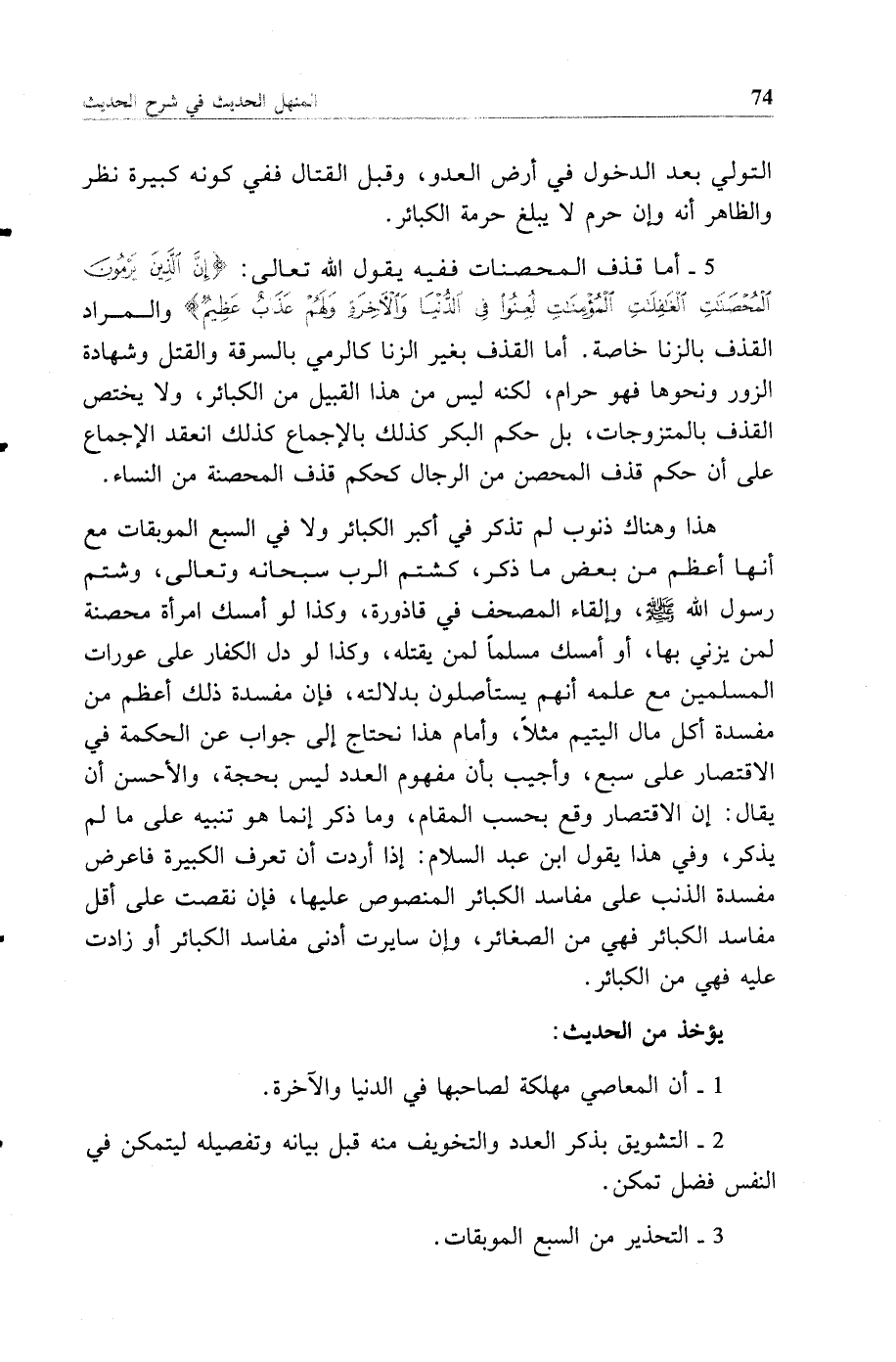 5 - أما قذف المحصنات ففيه يقول الله تعالى {إن الذين يرمون المحصنات الغافلات المؤمنات لعنوا في الدنيا والآخرة ولهم عذاب عظيم} والمراد القذف بالزنا خاصة أما القذف بغير الزنا كالرمي بالسرقة والقتل وشهادة الزور ونحوها فهو حرام لكنه ليس من هذا القبيل من الكبائر ولا يختص القذف بالمتزوجات بل حكم البكر كذلك بالإجماع كذلك انعقد الإجماع على أن حكم قذف المحصن من الرجال كحكم قذف المحصنة من النساء
