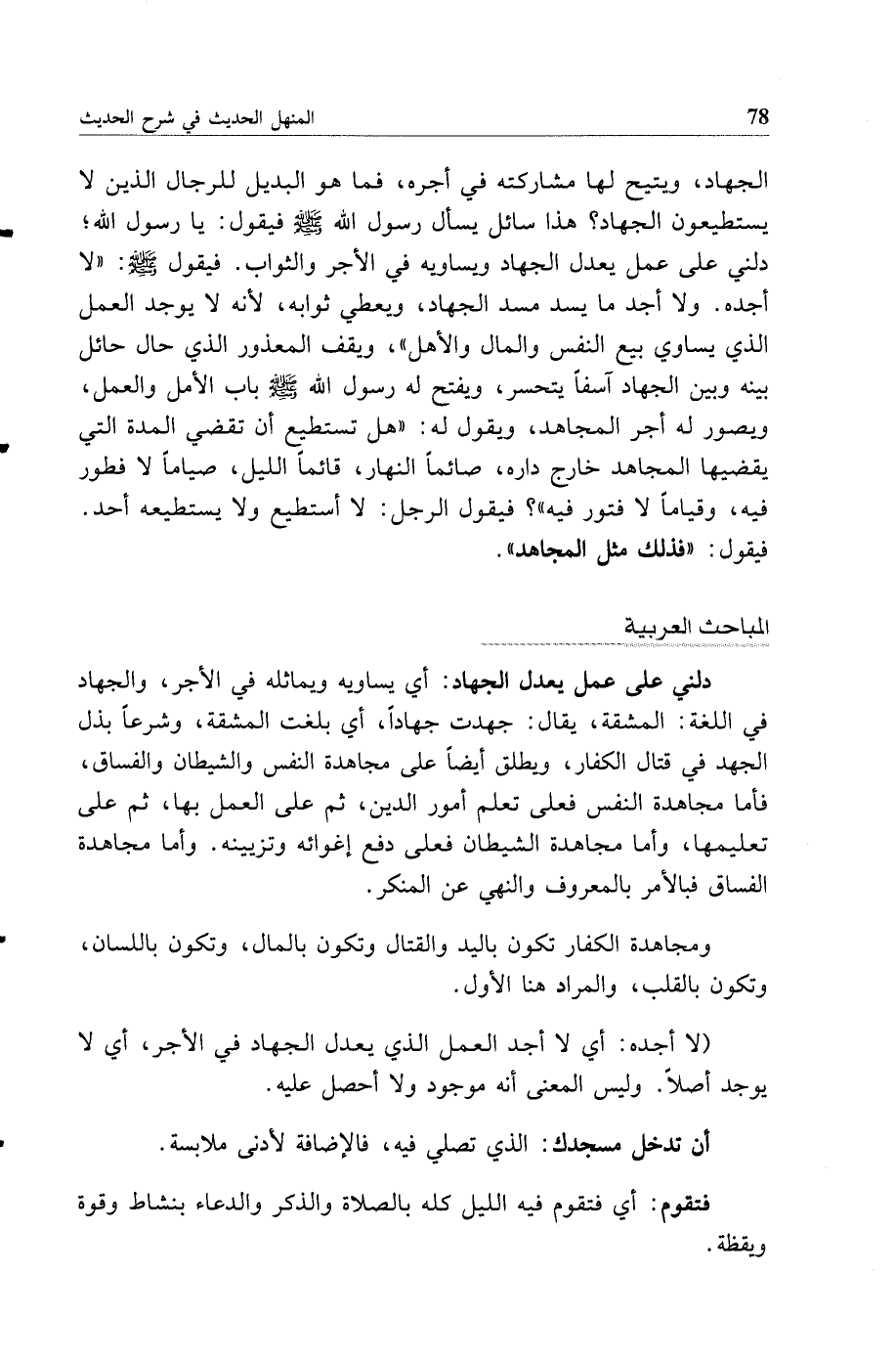(دلني على عمل يعدل الجهاد) أي يساويه ويماثله في الأجر والجهاد في اللغة المشقة يقال جهدت جهادا أي بلغت المشقة وشرعا بذل الجهد في قتال الكفار ويطلق أيضا على مجاهدة النفس والشيطان والفساق فأما مجاهدة النفس فعلى تعلم أمور الدين ثم على العمل بها ثم على تعليمها وأما مجاهدة الشيطان فعلى دفع إغوائه وتزيينه وأما مجاهدة الفساق فبالأمر بالمعروف والنهي عن المنكر