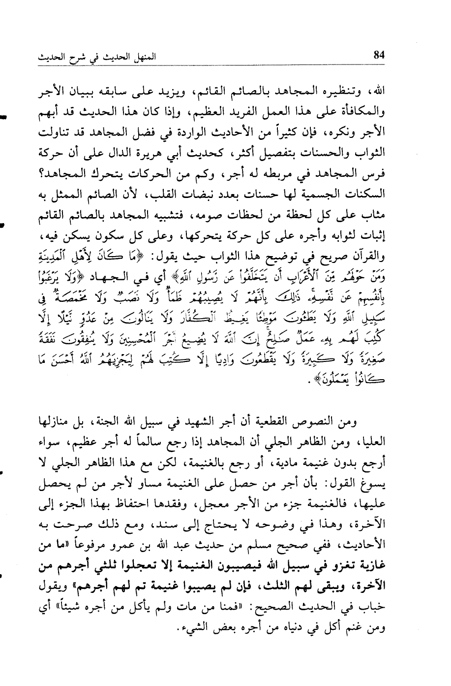 ومن النصوص القطعية أن أجر الشهيد في سبيل الله الجنة بل منازلها العليا ومن الظاهر الجلي أن المجاهد إذا رجع سالما له أجر عظيم سواء أرجع بدون غنيمة مادية أو رجع بالغنيمة لكن مع هذا الظاهر الجلي لا يسوغ القول بأن أجر من حصل على الغنيمة مساو لأجر من لم يحصل عليها فالغنيمة جزء من الأجر معجل وفقدها احتفاظ بهذا الجزء إلى الآخرة وهذا في وضوحه لا يحتاج إلى سند ومع ذلك صرحت به الأحاديث ففي صحيح مسلم من حديث عبد الله بن عمرو مرفوعا ما من غازية تغزو في سبيل الله فيصيبون الغنيمة إلا تعجلوا ثلثي أجرهم من الآخرة ويبقى لهم الثلث فإن لم يصيبوا غنيمة تم لهم أجرهم ويقول خباب في الحديث الصحيح فمنا من مات ولم يأكل من أجره شيئا أي ومن غنم أكل في دنياه من أجره بعض الشيء