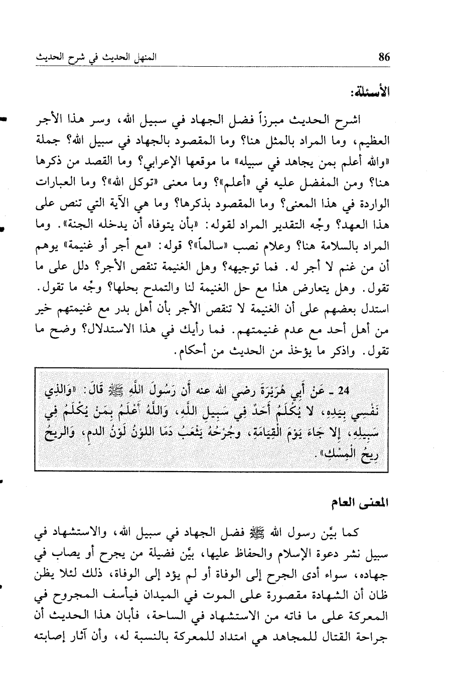 24 - عن أبي هريرة رضي الله عنه أن رسول الله صلى الله عليه وسلم قال والذي نفسي بيده لا يكلم أحد في سبيل الله والله أعلم بمن يكلم في سبيله إلا جاء يوم القيامة وجرحه يثعب دما اللون لون الدم والريح ريح المسك