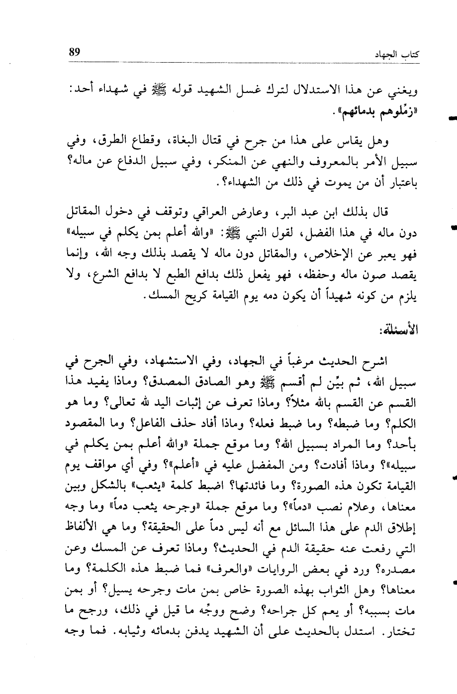 ويغني عن هذا الاستدلال لترك غسل الشهيد قوله صلى الله عليه وسلم في شهداء أحد زملوهم بدمائهم