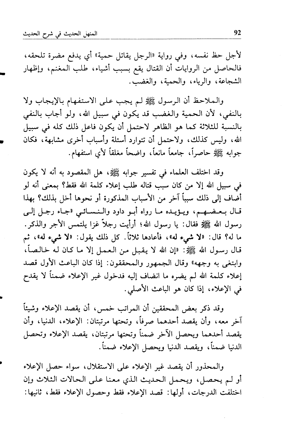 والمحذور أن يقصد غير الإعلاء على الاستقلال سواء حصل الإعلاء أو لم يحصل ويحمل الحديث الذي معنا على الحالات الثلاث وإن اختلفت الدرجات أولها قصد الإعلاء فقط وحصول الإعلاء فقط ثانيها
