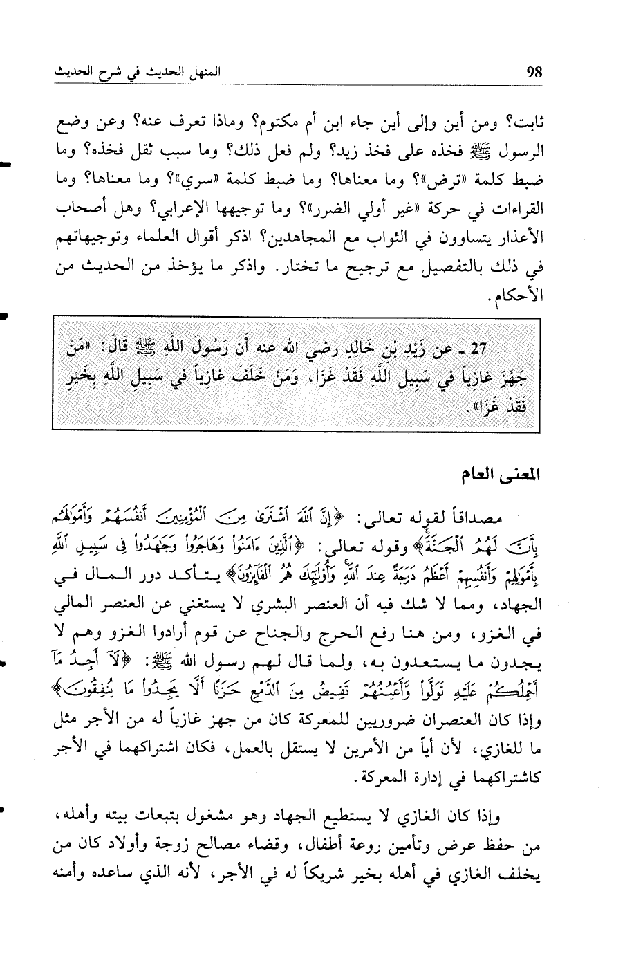 27 - عن زيد بن خالد رضي الله عنه أن رسول الله صلى الله عليه وسلم قال: من جهز غازيا في سبيل الله فقد غزا ومن خلف غازيا في سبيل الله بخير فقد غزا
