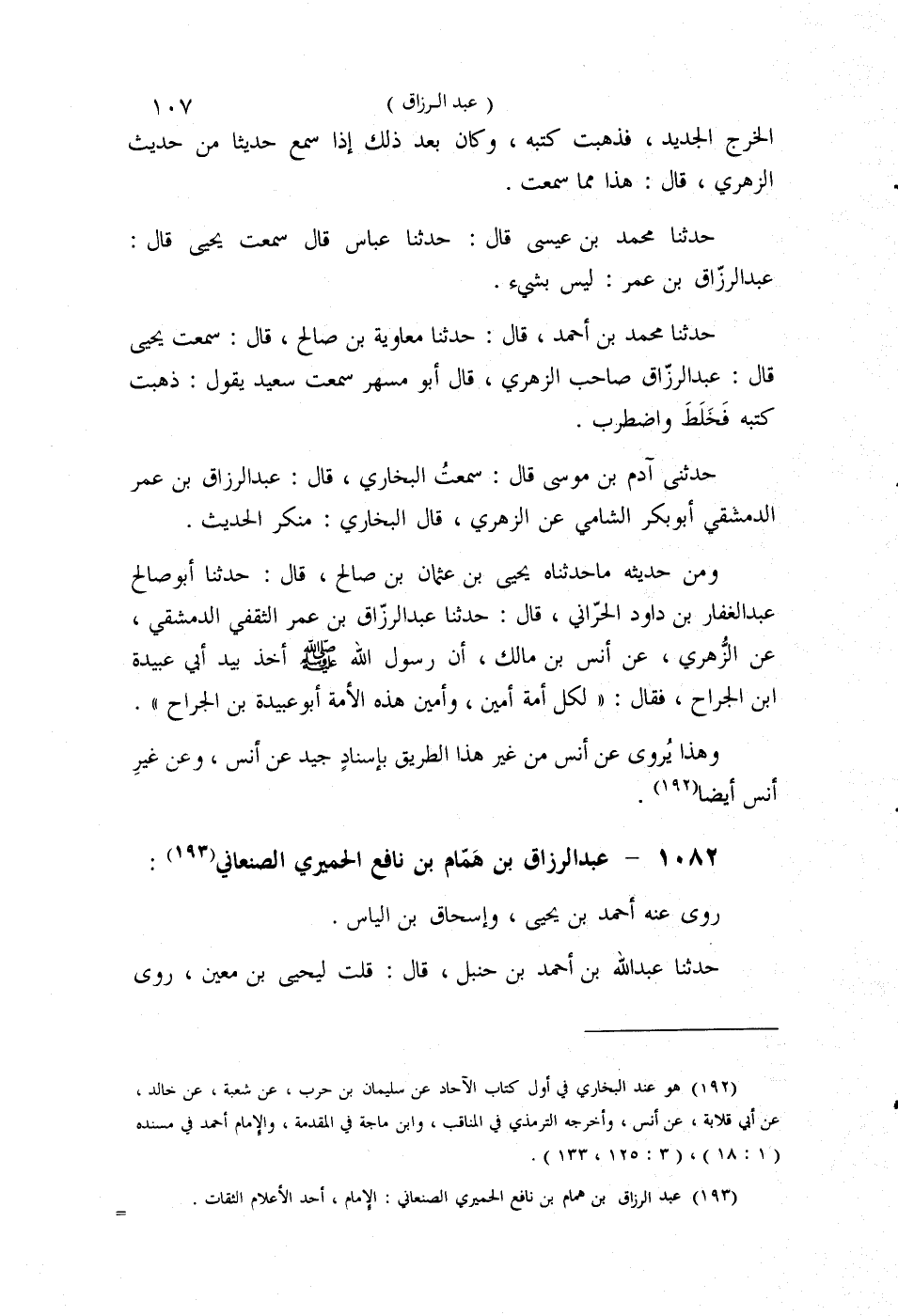 §1082 - عَبْدُ الرَّزَّاقِ بْنُ هَمَّامِ بْنِ نَافِعٍ الْحِمْيَرِيُّ الصَّنْعَانِيُّ رَوَى عَنْهُ أَحْمَدُ وَيَحْيَى وَإِسْحَاقُ وَالنَّاسُ. حَدَّثَنَا عَبْدُ اللَّهِ بْنُ أَحْمَدَ بْنِ حَنْبَلٍ قَالَ: قُلْتُ لِيَحْيَى بْنِ مَعِينٍ، وَعَبْدُ الرَّزَّاقِ تَخْشَى كَبِيرَ السِّنِ؟ قَالَ: أَمَّا حَيْثُ رَأَيْنَاهُ فَمَا كَانَ بَلَغَ الثَّمَانِينَ، كَانَ نَحْوًا مِنْ سَبْعِينَ، ثُمَّ قَالَ يَحْيَى: أَخْبَرَنِي أَبُو جَعْفَرٍ السُّوَيْدِيُّ أَنَّ قَوْمًا مِنَ الْخُرَاسَانِيَّةِ مِنْ أَصْحَابِ الْحَدِيثِ جَاءُوا إِلَى عَبْدِ الرَّزَّاقِ بِأَحَادِيثَ لِلْقَاضِي هِشَامِ بْنِ يُوسُفَ فَتَلَقَّطُوا أَحَادِيثَ عَنْ مَعْمَرٍ مِنْ حَدِيثِ هِشَامٍ وَأَبِي ثَوْرٍ، قَالَ يَحْيَى: وَكَانَ أَبُو ثَوْرٍ هَذَا ثِقَةٌ، فَجَاءُوا بِهَذَا إِلَى عَبْدِ الرَّزَّاقِ فَنَظَرَ فِيهَا فَقَالَ: هَذِهِ بَعْضُهَا سَمِعْتُهَا وَبَعْضُهَا لَا أَعْرِفُهَا وَلَمْ أَسْمَعْهَا، قَالَ: فَلَمْ يُفَارِقُوهُ حَتَّى قَرَأَهَا وَلَمْ يَقُلْ لَهُمْ حَدَّثَنَا وَلَا أَخْبَرَنَا. قَالَ أَبُو زَكَرِيَّا: أَخْبَرَنِي بِهَذِهِ الْقِصَّةِ أَبُو جَعْفَرٍ السُّوَيْدِيُّ صَاحِبٌ لَنَا. حَدَّثَنَا عَبْدُ اللَّهِ بْنُ أَحْمَدَ قَالَ: سَمِعْتُ يَحْيَى قَالَ: رَأَيْتُ عَبْدَ الرَّزَّاقِ بِمَكَّةَ يُحَدِّثُ فَقُلْتُ لَهُ: هَذِهِ الْأَحَادِيثُ سَمِعْتَهَا؟ فَقَالَ: بَعْضُهَا سَمِعْتُهَا، وَبَعْضُهَا عَرْضًا، وَبَعْضُهَا ذَكَرَهُ، وَكُلٌّ سَمَاعٌ، قَالَ لِي يَحْيَى: مَا كَتَبْتُ عَنْ عَبْدِ الرَّزَّاقِ حَدِيثًا وَاحِدًا إِلَّا مِنْ كِتَابِهِ كُلِّهِ. حَدَّثَنِي آدَمُ بْنُ مُوسَى قَالَ: سَمِعْتُ الْبُخَارِيَّ قَالَ: عَبْدُ الرَّزَّاقِ بْنُ هَمَّامٍ -[109]- مَا حَدَّثَ مِنْ كِتَابِهِ فَهُوَ أَصَحُّ. حَدَّثَنَا مُحَمَّدُ بْنُ أَيُّوبَ قَالَ: سَأَلْتُ مُحَمَّدَ بْنَ أَبِي بَكْرٍ الْمُقَدَّمِيَّ عَنْ حَدِيثٍ لِجَعْفَرِ بْنِ سُلَيْمَانَ فَقُلْتُ: رَوَى عَنْهُ عَبْدُ الرَّزَّاقِ؟ فَقَالَ: فَقَدْتَ عَبْدَ الرَّزَّاقِ، مَا أَفْسَدَ جَعْفَرَ غَيْرُهُ. حَدَّثَنَا أَحْمَدُ بْنُ مَحْمُودٍ أَبُو الْحَسَنِ الْهَرَوِيُّ قَالَ: حَدَّثَنَا أَبُو زُرْعَةَ الرَّازِيُّ عُبَيْدُ اللَّهِ بْنُ عَبْدِ الْكَرِيمِ قَالَ: حَدَّثَنَا عَبْدُ اللَّهِ بْنُ مُحَمَّدٍ الْمُسْنَدِيُّ قَالَ: وَدَّعْتُ ابْنَ عُيَيْنَةَ قُلْتُ: أُرِيدُ عَبْدَ الرَّزَّاقِ قَالَ: أَخَافُ أَنْ يَكُونَ مِنَ الَّذِينَ ضَلَّ سَعْيُهُمْ فِي الْحَيَاةِ الدُّنْيَا. حَدَّثَنَا مُحَمَّدُ بْنُ عِيسَى قَالَ: حَدَّثَنَا الْعَبَّاسُ بْنُ مُحَمَّدٍ قَالَ: سَمِعْتُ يَحْيَى بْنَ مَعِينٍ يَقُولُ: قَالَ هِشَامُ بْنُ يُوسُفَ: عَرَضَ مَعْمَرٌ هَذِهِ الْأَحَادِيثَ عَلَى هَمَّامٍ إِلَّا أَنَّهُ سَمِعَ مِنْهَا نَيِّفًا وَثَلَاثِينَ حَدِيثًا. وَسَمِعْتُ عَبْدَ الرَّزَّاقِ يَقُولُ: سَمِعْنَا وَعَرَضْنَا. حَدَّثَنِي أَحْمَدُ بْنُ زُكَيْرٍ الْحَضْرَمِيُّ قَالَ: حَدَّثَنَا مُحَمَّدُ بْنُ إِسْحَاقَ بْنِ يَزِيدَ الْبَصْرِيُّ قَالَ: سَمِعْتُ مَخْلَدًا الشَّعِيرِيَّ يَقُولُ: كُنْتُ عِنْدَ عَبْدِ الرَّزَّاقِ فَذُكِرَ رَجُلٌ عِنْدَ مُعَاوِيَةَ فَقَالَ: لَا تُقَذِّرْ مَجْلِسَنَا بِذِكْرِ وَلَدِ أَبِي سُفْيَانَ. حَدَّثَنَا مُحَمَّدُ بْنُ أَحْمَدَ بْنِ حَمَّادٍ، سَمِعْتُ مُحَمَّدَ بْنَ عُثْمَانَ الثَّقَفِيَّ الْبَصْرِيَّ قَالَ: لَمَّا قَدِمَ الْعَبَّاسُ بْنُ عَبْدِ الْعَظِيمِ مِنْ صَنْعَاءَ مِنْ عِنْدِ عَبْدِ الرَّزَّاقِ وَكَانَ رَحَلَ إِلَيْهِ لِلْحَدِيثِ أَتَيْنَاهُ نُسَلِّمُ عَلَيْهِ فَقَالَ لَنَا وَنَحْنُ جَمَاعَةٌ عِنْدَهُ فِي الْبَيْتِ: أَلَسْتُ قَدْ تَجَشَّمْتُ الْخُرُوجَ إِلَى عَبْدِ الرَّزَّاقِ فَدَخ