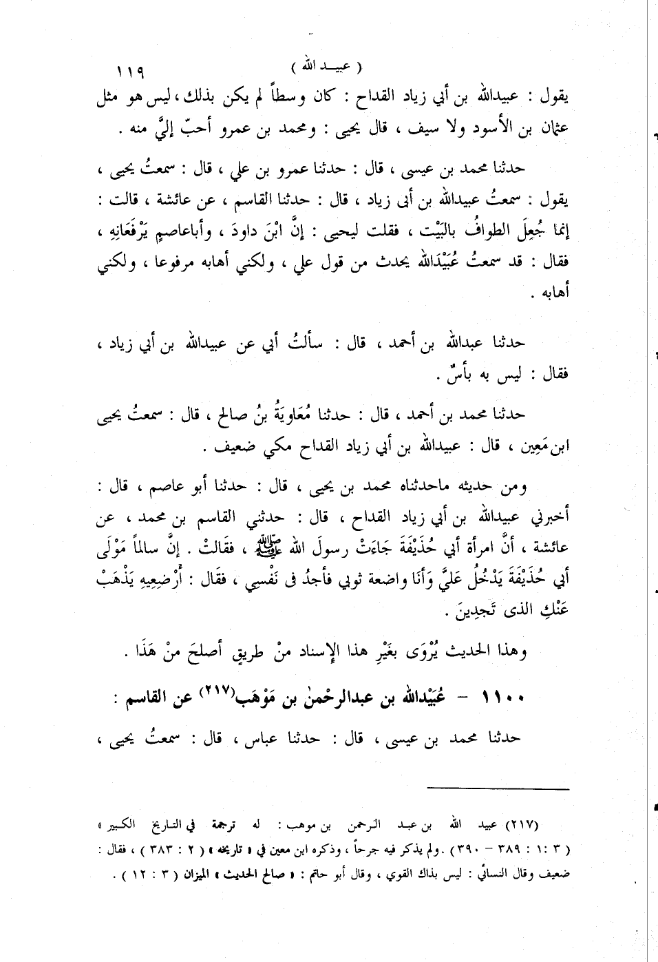 §1100 - عُبَيْدُ اللَّهِ بْنُ عَبْدِ الرَّحْمَنِ بْنِ مَوْهَبِ، عَنِ الْقَاسِمِ حَدَّثَنَا مُحَمَّدُ بْنُ عِيسَى قَالَ: حَدَّثَنَا عَبَّاسٌ قَالَ: سَمِعْتُ يَحْيَى يَقُولُ: عُبَيْدُ اللَّهِ بْنُ عَبْدِ الرَّحْمَنِ بْنِ مَوْهَبِ مَدِينِيٌّ يَرْوِي عَنِ الْقَاسِمِ، وَهُوَ ضَعِيفٌ