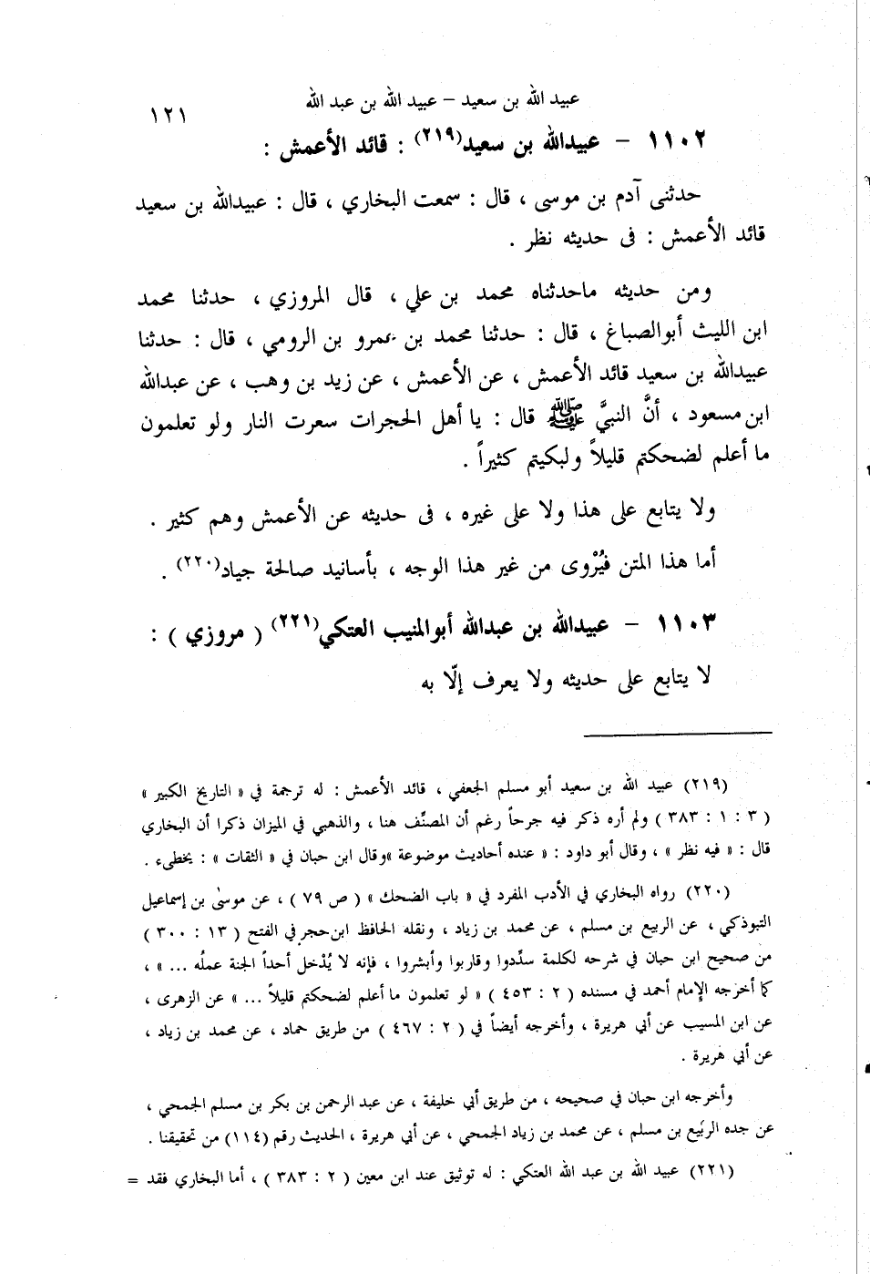§1102 - عُبَيْدُ اللَّهِ بْنُ سَعِيدٍ قَائِدُ الْأَعْمَشِ حَدَّثَنِي آدَمُ بْنُ مُوسَى قَالَ: سَمِعْتُ الْبُخَارِيَّ قَالَ: عُبَيْدُ اللَّهِ بْنُ سَعِيدٍ قَائِدُ الْأَعْمَشِ فِي حَدِيثِهِ نَظَرٌ