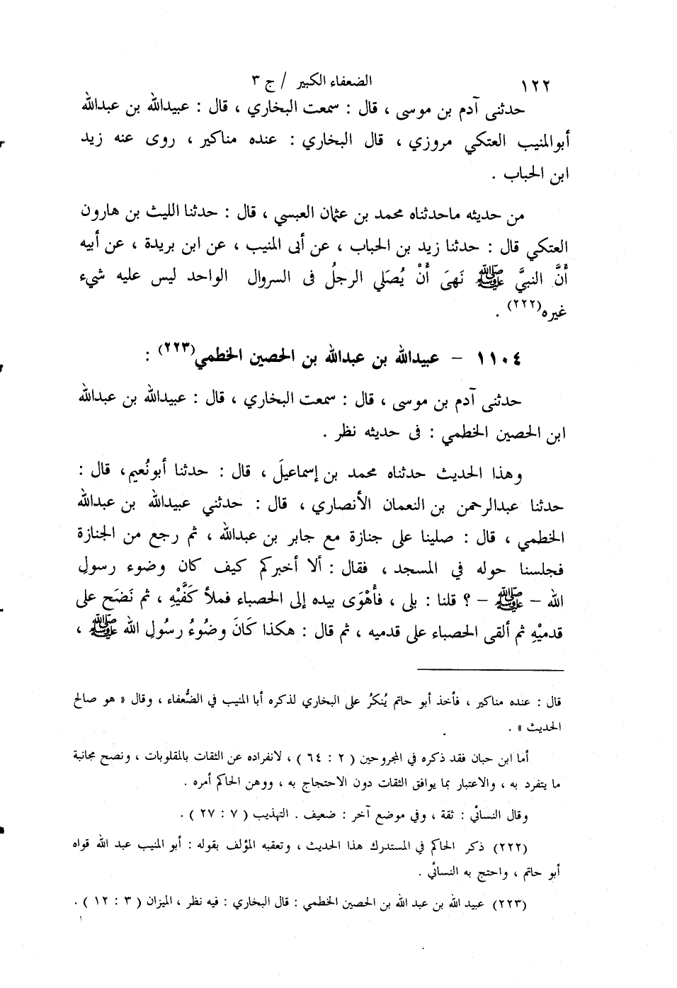§1104 - عُبَيْدُ اللَّهِ بْنُ عَبْدِ اللَّهِ بْنِ الْحُصَيْنِ الْخَطْمِيُّ حَدَّثَنِي آدَمُ بْنُ مُوسَى قَالَ: سَمِعْتُ الْبُخَارِيَّ قَالَ: عُبَيْدُ اللَّهِ بْنُ عَبْدِ اللَّهِ بْنِ الْحُصَيْنِ الْخَطْمِيُّ فِي حَدِيثِهِ نَظَرٌ