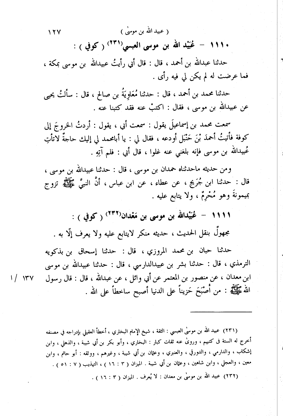 §1110 - عُبَيْدُ اللَّهِ بْنُ مُوسَى الْعَبْسِيُّ كُوفِيٌّ حَدَّثَنَا عَبْدُ اللَّهِ بْنُ أَحْمَدَ قَالَ: قَالَ أَبِي: رَأَيْتُ عُبَيْدَ اللَّهِ بْنَ مُوسَى بِمَكَّةَ فَمَا عَرَضْتُ لَهُ، لَمْ يَكُنْ لِي فِيهِ رَأْيٌ. حَدَّثَنَا مُحَمَّدُ بْنُ أَحْمَدَ قَالَ: حَدَّثَنَا مُعَاوِيَةُ بْنُ صَالِحٍ قَالَ: سَأَلْتُ يَحْيَى عَنْ عُبَيْدِ اللَّهِ بْنِ مُوسَى، فَقَالَ: اكْتُبْ عَنْهُ، فَقَدْ كَتَبْنَا عَنْهُ. سَمِعْتُ مُحَمَّدَ بْنَ إِسْمَاعِيلَ يَقُولُ: سَمِعْتُ أَبِي يَقُولُ: أَرَدْتُ الْخُرُوجَ إِلَى الْكُوفَةِ فَأَتَيْتُ أَحْمَدَ بْنَ حَنْبَلٍ أُوَدِّعُهُ فَقَالَ لِي: يَا أَبَا مُحَمَّدٍ، لِي إِلَيْكَ حَاجَةٌ، لَا تَأْتِ عُبَيْدَ اللَّهِ بْنَ مُوسَى، فَإِنَّهُ بَلَغَنِي عَنْهُ غُلُوًّا، قَالَ أَبِي: فَلَمْ آتِهِ