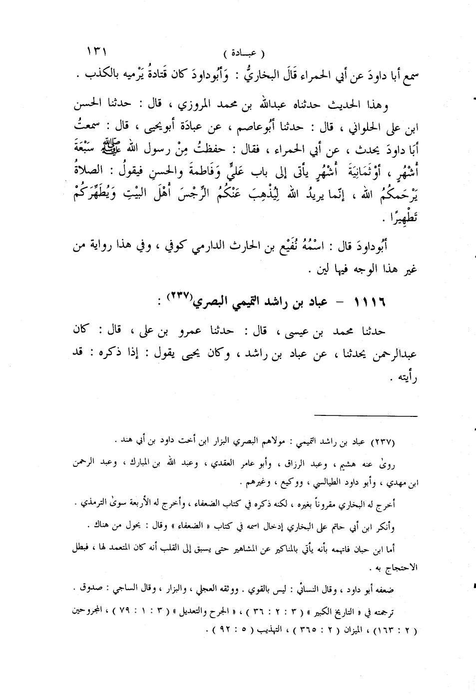 §1116 - عَبَّادُ بْنُ رَاشِدٍ التَّمِيمِيُّ الْبَصْرِيُّ حَدَّثَنَا مُحَمَّدُ بْنُ عِيسَى قَالَ: حَدَّثَنَا عَمْرُو بْنُ عَلِيٍّ قَالَ: كَانَ عَبْدُ الرَّحْمَنِ يُحَدِّثُنَا عَنْ عَبَّادِ بْنِ رَاشِدٍ، وَكَانَ، يَحْيَى يَقُولُ إِذَا ذَكَرَهُ: قَدْ رَأَيْتُهُ -[132]- حَدَّثَنَا مُحَمَّدُ بْنُ عِيسَى قَالَ: حَدَّثَنَا عَبَّاسٌ قَالَ: سَمِعْتُ يَحْيَى قَالَ: عَبَّادُ بْنُ رَاشِدٍ وَعَبَّادُ بْنُ مَنْصُورٍ وَعَبَّادُ بْنُ مَيْسَرَةَ الْمِنْقَرِيُّ وَعَبَّادُ بْنُ كَثِيرٍ كُلُّهُمْ لَيْسَ حَدِيثُهُمْ بِالْقَوِيِّ وَلَكِنَّهَا تُكْتَبُ