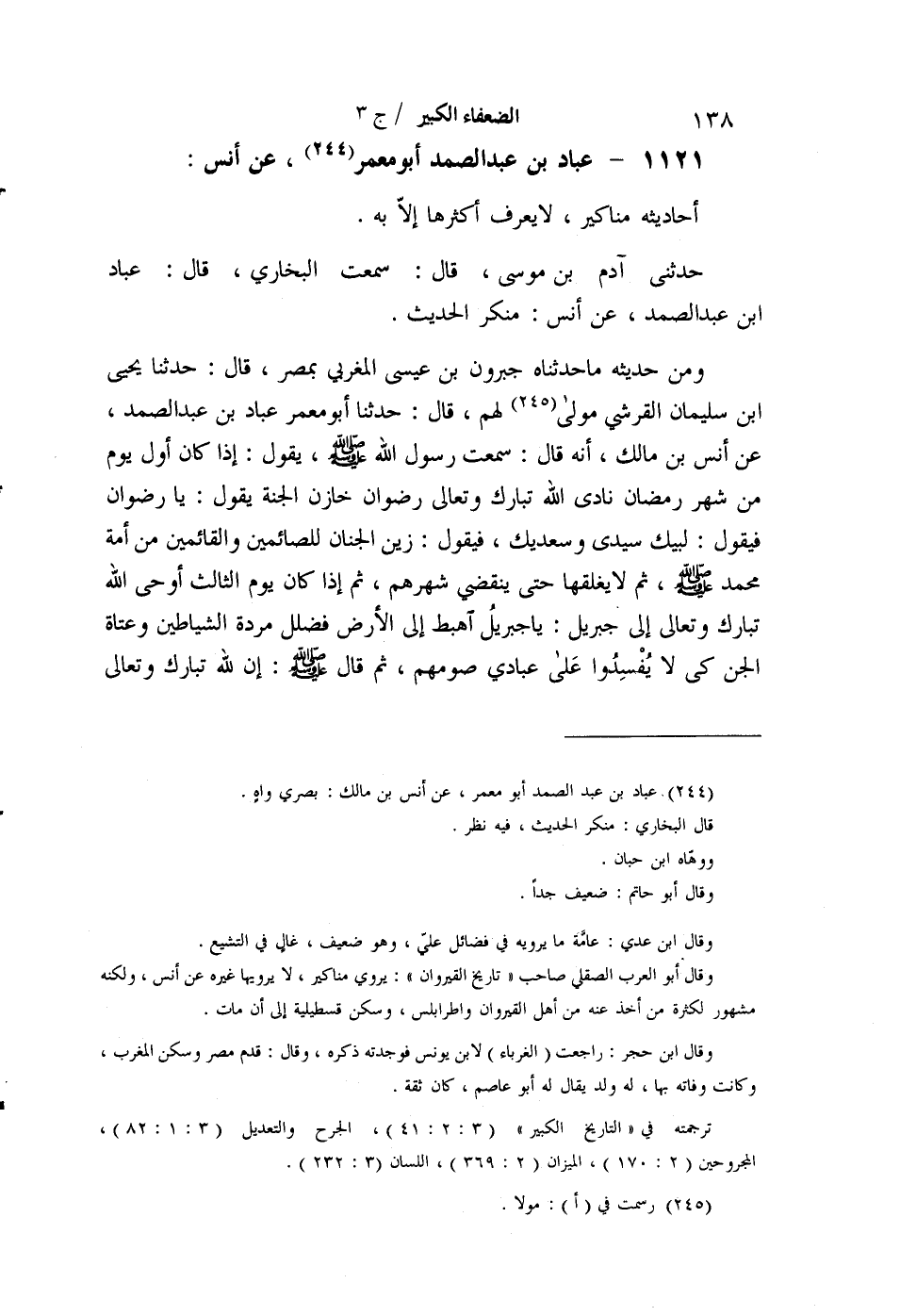§1121 - عَبَّادُ بْنُ عَبْدِ الصَّمَدِ أَبُو مَعْمَرٍ عَنْ أَنَسٍ أَحَادِيثُهُ مَنَاكِيرُ لَا يُعْرَفُ أَكْثَرُهَا إِلَّا بِهِ. حَدَّثَنِي آدَمُ بْنُ مُوسَى قَالَ: سَمِعْتُ الْبُخَارِيَّ قَالَ: عَبَّادُ بْنُ عَبْدِ الصَّمَدِ عَنْ أَنَسٍ: مُنْكَرُ الْحَدِيثِ