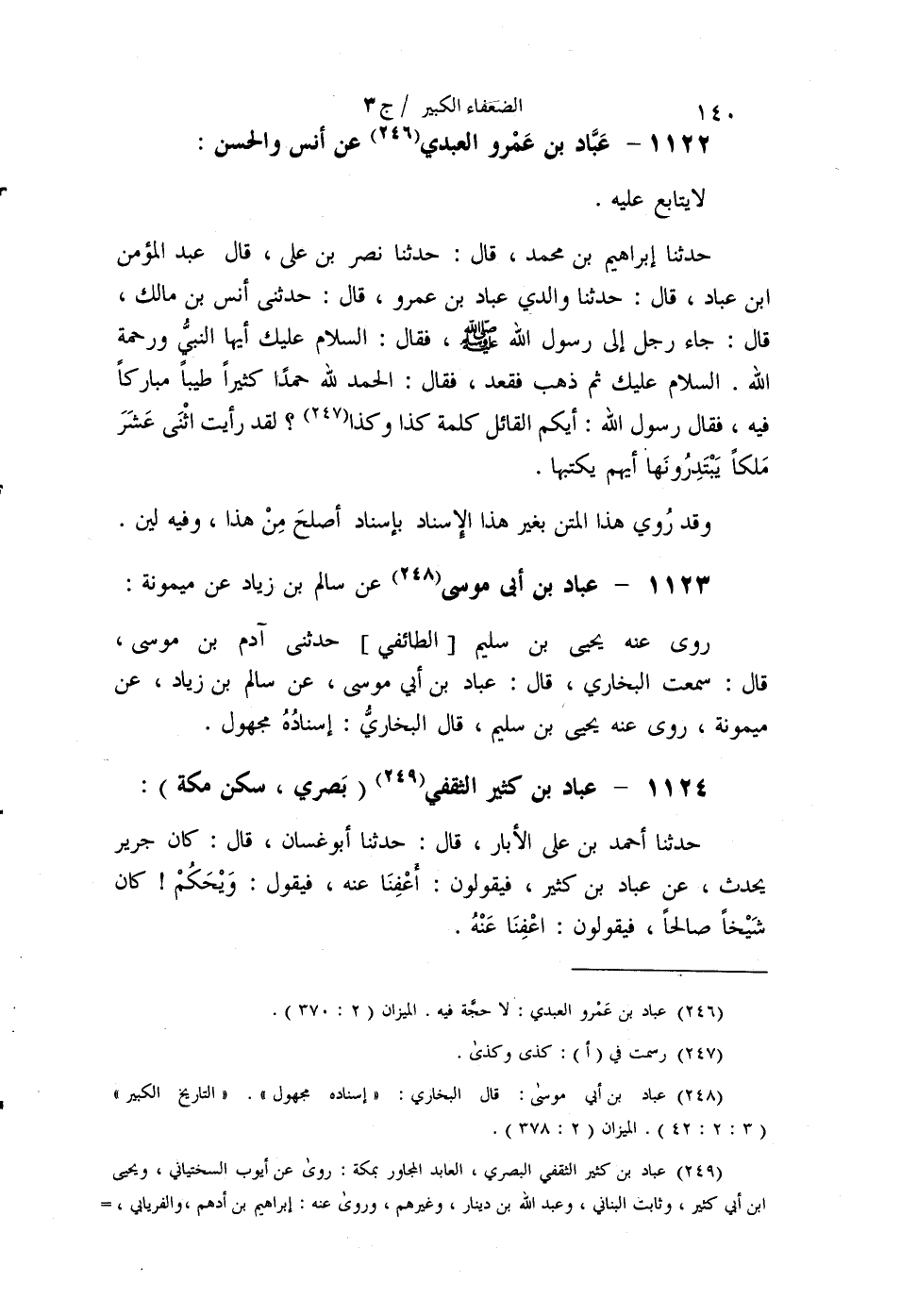 §1124 - عَبَّادُ بْنُ كَثِيرٍ الثَّقَفِيُّ بَصْرِيٌّ سَكَنَ مَكَّةَ حَدَّثَنَا أَحْمَدُ بْنُ عَلِيٍّ الْأَبَّارُ قَالَ: حَدَّثَنَا أَبُو غَسَّانَ قَالَ: كَانَ جَرِيرٌ يُحَدِّثُ عَنْ عَبَّادِ بْنِ كَثِيرٍ، فَيَقُولُونَ: أَعْفِنَا عَنْهُ، فَيَقُولُ: وَيْحَكُمْ، كَانَ شَيْخًا صَالِحًا، فَيَقُولُونَ: أَعْفِنَا عَنْهُ حَدَّثَنَا مُحَمَّدٌ قَالَ: حَدَّثَنَا عَبَّاسٌ قَالَ: سَمِعْتُ يَحْيَى قَالَ: عَبَّادُ بْنُ كَثِيرٍ لَيْسَ بِشَيْءٍ حَدَّثَنِي آدَمُ بْنُ مُوسَى قَالَ: سَمِعْتُ الْبُخَارِيَّ قَالَ: عَبَّادُ بْنُ كَثِيرٍ الثَّقَفِيُّ بَصْرِيٌّ سَكَنَ مَكَّةَ تَرَكُوهُ حَدَّثَنِي عَبْدُ اللَّهِ بْنُ أَحْمَدَ الْمَرْوَزِيُّ قَالَ: حَدَّثَنَا مُحَمَّدُ بْنُ اللَّيْثِ الْمَرْوَزِيُّ قَالَ: حَدَّثَنَا رَافِعُ بْنُ أَشْرَسَ قَالَ: سَمِعْتُ ابْنَ إِدْرِيسَ يَقُولُ: كَانَ شُعْبَةُ لَا يَسْتَغْفِرُ لَعَبَّادِ بْنِ كَثِيرٍ