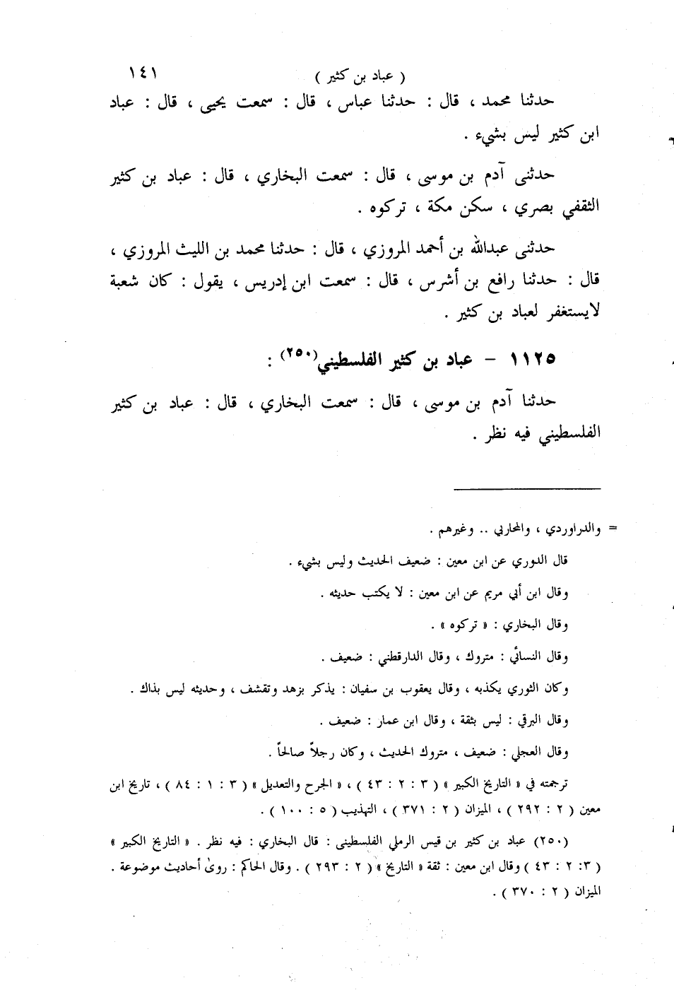 §1125 - عَبَّادُ بْنُ كَثِيرٍ الْفِلَسْطِينِيُّ حَدَّثَنَا آدَمُ بْنُ مُوسَى قَالَ: سَمِعْتُ الْبُخَارِيَّ قَالَ: عَبَّادُ بْنُ كَثِيرٍ الْفِلَسْطِينِيُّ فِيهِ نَظَرٌ