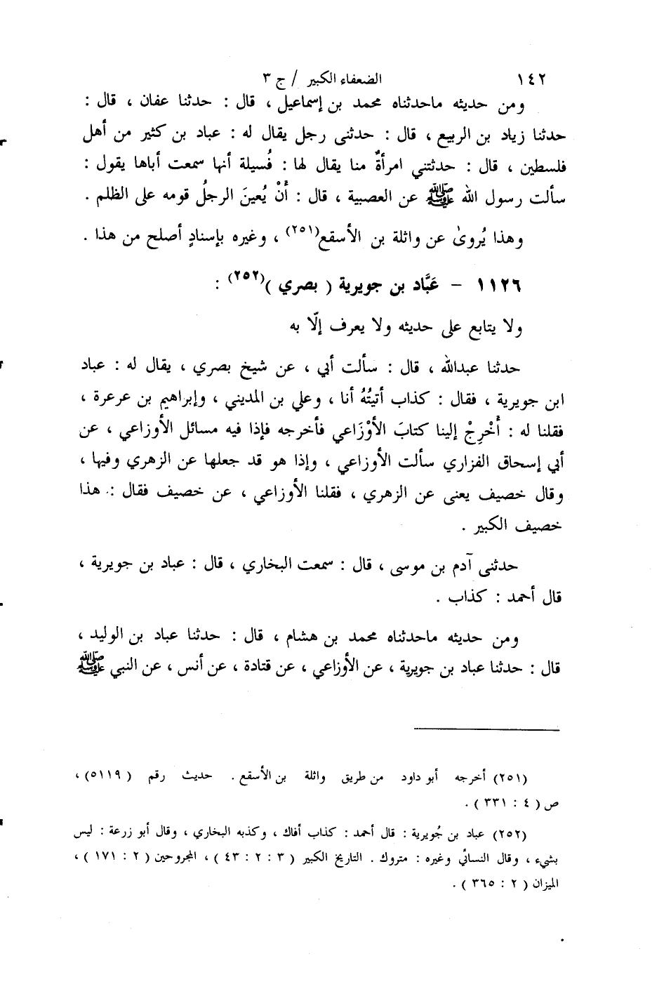 §1126 - عَبَّادُ بْنُ جُوَيْرِيَةَ بَصْرِيٌّ وَلَا يُتَابَعُ عَلَى حَدِيثِهِ، وَلَا يُعْرَفُ إِلَّا بِهِ. حَدَّثَنَا عَبْدُ اللَّهِ قَالَ: سَأَلْتُ أَبِي عَنْ شَيْخٍ بَصْرِيٍّ يُقَالُ لَهُ عَبَّادُ بْنُ جُوَيْرِيَّةَ فَقَالَ: كَذَّابٌ، أَتَيْتُهُ أَنَا وَعَلِيُّ بْنُ الْمَدِينِيِّ، وَإِبْرَاهِيمُ بْنُ عَرْعَرَةَ، فَقُلْنَا لَهُ: أَخْرِجْ إِلَيْنَا كِتَابَ الْأَوْزَاعِيِّ، فَأَخْرَجَهُ فَإِذَا فِيهِ مَسَائِلُ الْأَوْزَاعِيِّ عَنْ أَبِي إِسْحَاقَ الْفَزَارِيِّ، سَأَلْتُ الْأَوْزَاعِيَّ، وَإِذَا هُوَ قَدْ جَعَلَهَا عَنِ الزُّهْرِيِّ، وَفِيهَا: وَقَالَ خُصَيْفٌ يَعْنِي عَنِ الزُّهْرِيِّ، فَقُلْنَا: الْأَوْزَاعِيُّ عَنْ خُصَيْفٍ؟ فَقَالَ: هَذَا خُصَيْفٌ الْكَبِيرُ. حَدَّثَنِي آدَمُ بْنُ مُوسَى قَالَ: سَمِعْتُ الْبُخَارِيَّ قَالَ: عَبَّادُ بْنُ جُوَيْرِيَةَ قَالَ أَحْمَدُ: كَذَّابٌ