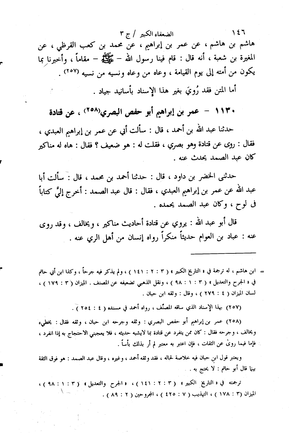 §1130 - عُمَرُ بْنُ إِبْرَاهِيمَ أَبُو حَفْصٍ الْبَصْرِيُّ عَنْ قَتَادَةَ. حَدَّثَنَا عَبْدُ اللَّهِ بْنُ أَحْمَدَ قَالَ: سَأَلْتُ أَبِي عَنْ عُمَرَ بْنِ إِبْرَاهِيمَ الْعَبْدِيِّ، فَقَالَ: رَوَى عَنْ قَتَادَةَ، وَهُوَ بَصْرِيٌّ، فَقُلْتُ لَهُ: هُوَ ضَعِيفٌ؟ فَقَالَ: هَاهْ، لَهُ مَنَاكِيرُ، كَانَ عَبْدُ الصَّمَدِ يُحَدِّثُ عَنْهُ. حَدَّثَنِي الْخَضِرُ بْنُ دَاوُدَ قَالَ: حَدَّثَنَا أَحْمَدُ بْنُ مُحَمَّدٍ قَالَ: سَأَلْتُ أَبَا عَبْدِ اللَّهِ عَنْ عُمَرَ بْنِ إِبْرَاهِيمَ الْعَبْدِيِّ، فَقَالَ: قَالَ عَبْدُ الصَّمَدِ: أَخْرَجَ إِلَيَّ كِتَابًا فِي لَوْحٍ، وَكَانَ عَبْدُ الصَّمَدِ يَحْمَدُهُ. قَالَ أَبُو عَبْدِ اللَّهِ: يَرْوِي عَنْ قَتَادَةَ، أَحَادِيثَ مَنَاكِيرَ، وَيُخَالِفُ، وَقَدْ رَوَى عَنْهُ، عَبَّادُ بْنُ الْعَوَّامِ حَدِيثًا مُنْكَرًا رَوَاهُ إِنْسَانٌ مِنْ أَهْلِ الرِّيِّ عَنْهُ. قُلْتُ لَهُ: إِبْرَاهِيمُ بْنُ مُوسَى؟ فَقَالَ: نَعَمْ، فَقُلْتُ: حَدِيثُ الْعَبَّاسِ؟ فَقَالَ: نَعَمْ