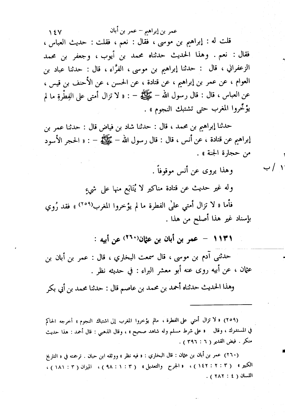 §1131 - عُمَرُ بْنُ أَبَانَ بْنِ عُثْمَانَ عَنْ أَبِيهِ حَدَّثَنِي آدَمُ بْنُ مُوسَى قَالَ: سَمِعْتُ الْبُخَارِيَّ قَالَ: عُمَرُ بْنُ أَبَانَ بْنِ عُثْمَانَ عَنْ أَبِيهِ، رَوَى عَنْهُ أَبُو مَعْشَرٍ الْبَرَاءُ، فِي حَدِيثِهِ نَظَرٌ