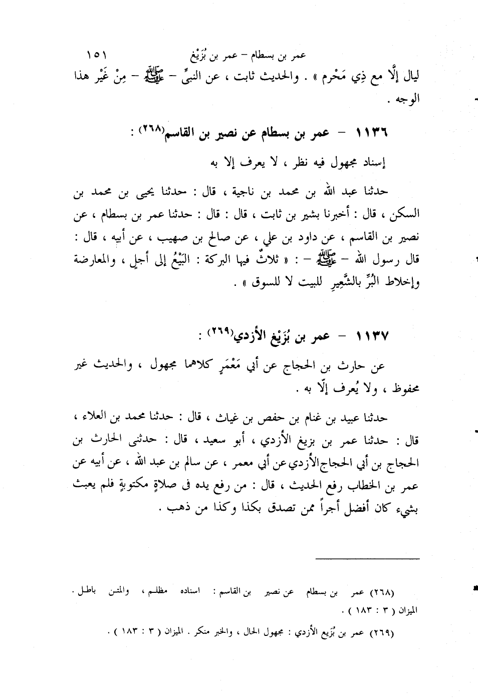 §1136 - عُمَرُ بْنُ بِسْطَامٍ عَنْ نُصَيْرِ بْنِ الْقَاسِمِ إِسْنَادٌ مَجْهُولٌ فِيهِ نَظَرٌ، لَا يُعْرَفُ إِلَّا بِهِ
