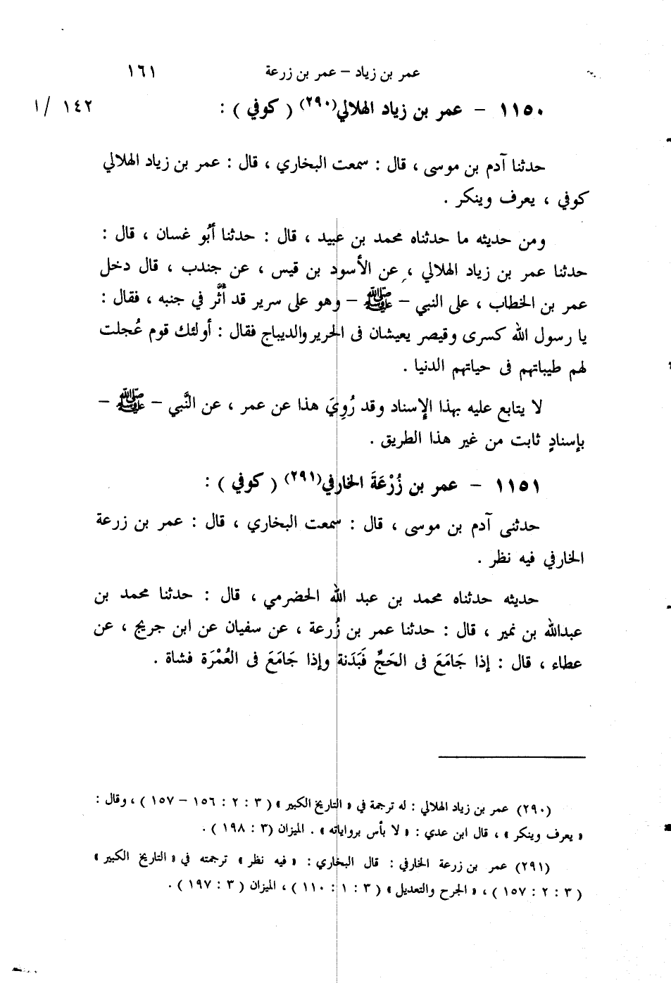 §1151 - عُمَرُ بْنُ زُرْعَةَ الْخَارِفِيُّ كُوفِيٌّ حَدَّثَنِي آدَمُ بْنُ مُوسَى قَالَ: سَمِعْتُ الْبُخَارِيَّ قَالَ: عُمَرُ بْنُ زُرْعَةَ الْخَارِفِيُّ فِيهِ نَظَرٌ
