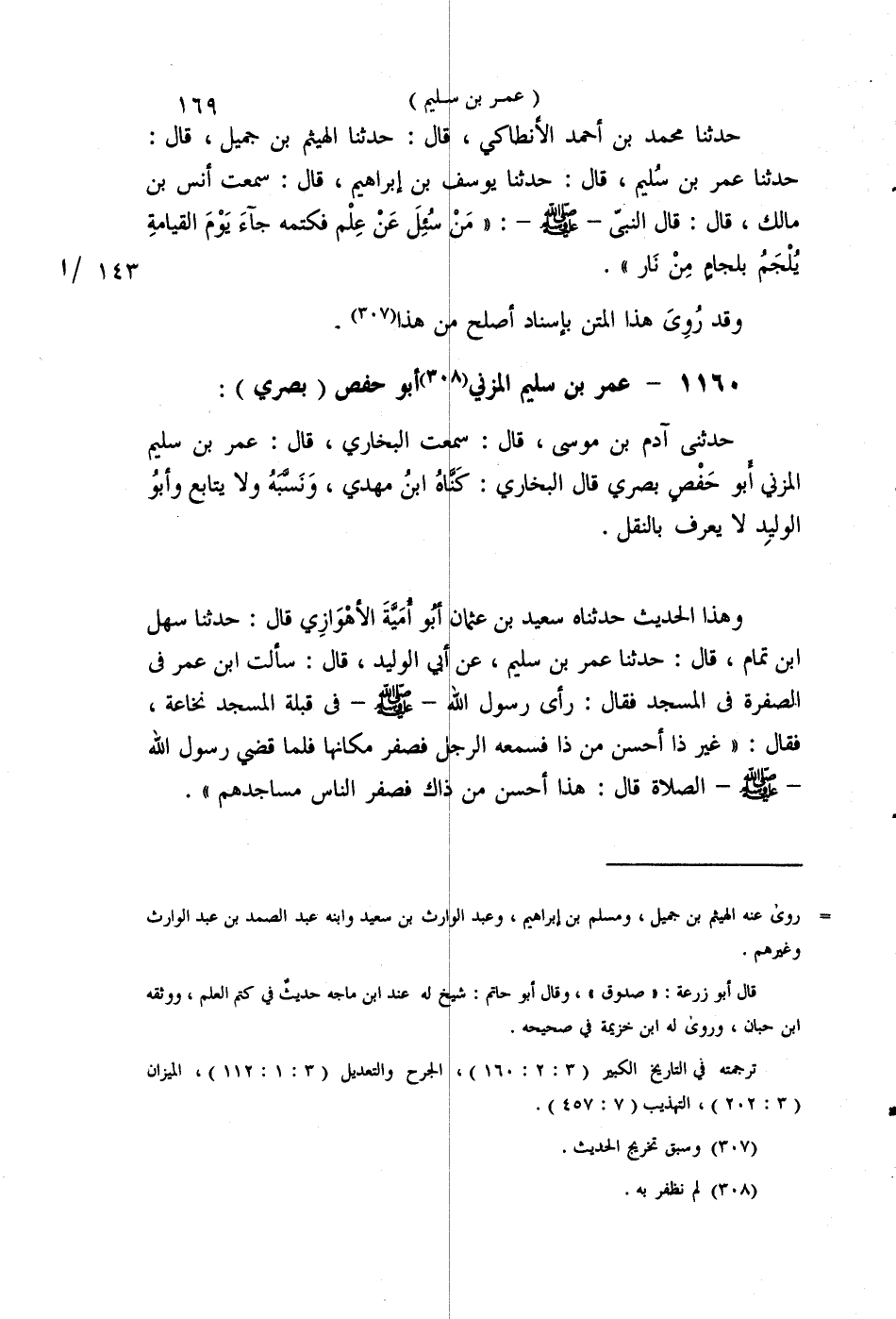 §1160 - عُمَرُ بْنُ سُلَيْمٍ الْمُزَنِيُّ أَبُو حَفْصٍ بَصْرِيٌّ حَدَّثَنِي آدَمُ بْنُ مُوسَى قَالَ: سَمِعْتُ الْبُخَارِيَّ قَالَ: عُمَرُ بْنُ سُلَيْمٍ الْمُزَنِيُّ أَبُو حَفْصٍ بَصْرِيٌّ قَالَ الْبُخَارِيُّ: كَنَّاهُ ابْنُ مَهْدِيٍّ وَنَسَبُهُ، وَلَا يُتَابَعُ، وَأَبُو الْوَلِيدِ لَا يُعْرَفُ بِالنَّقْلِ