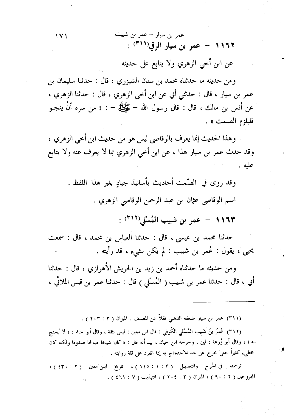 وَمِنْ حَدِيثِهِ: مَا حَدَّثَنَاهُ مُحَمَّدُ بْنُ سِنَانٍ الشَّيْزَرِيُّ قَالَ: حَدَّثَنَا سُلَيْمَانُ بْنُ عُمَرَ بْنِ سَيَّارٍ قَالَ: حَدَّثَنِي أَبِي، عَنِ ابْنِ أَخِي الزُّهْرِيِّ قَالَ: حَدَّثَنَا الزُّهْرِيُّ، عَنْ أَنَسِ بْنِ مَالِكٍ قَالَ: قَالَ رَسُولُ اللَّهِ صَلَّى اللهُ عَلَيْهِ وَسَلَّمَ: §«مَنْ سَرَّهُ أَنْ يَنْجُوَ فَلْيَلْزَمِ الصَّمْتَ» وَهَذَا الْحَدِيثُ إِنَّمَا يُعْرَفُ بِالْوَقَّاصِيِّ، لَيْسَ هُوَ مِنْ حَدِيثِ ابْنِ أَخِي الزُّهْرِيِّ، وَقَدْ حَدَّثَ عُمَرُ بْنُ سَيَّارٍ هَذَا عَنِ ابْنِ أَخِي الزُّهْرِيِّ بِمَا لَا يُعْرَفُ عَنْهُ وَلَا يُتَابَعُ عَلَيْهِ. وَقَدْ رُوِيَ فِي الصَّمْتِ أَحَادِيثَ بِأَسَانِيدَ جِيَادٍ بِغَيْرِ هَذَا اللَّفْظِ. اسْمُ الْوَقَّاصِيِّ عُثْمَانُ بْنُ عَبْدِ الرَّحْمَنِ الْوَقَّاصِيُّ الزُّهْرِيُّ