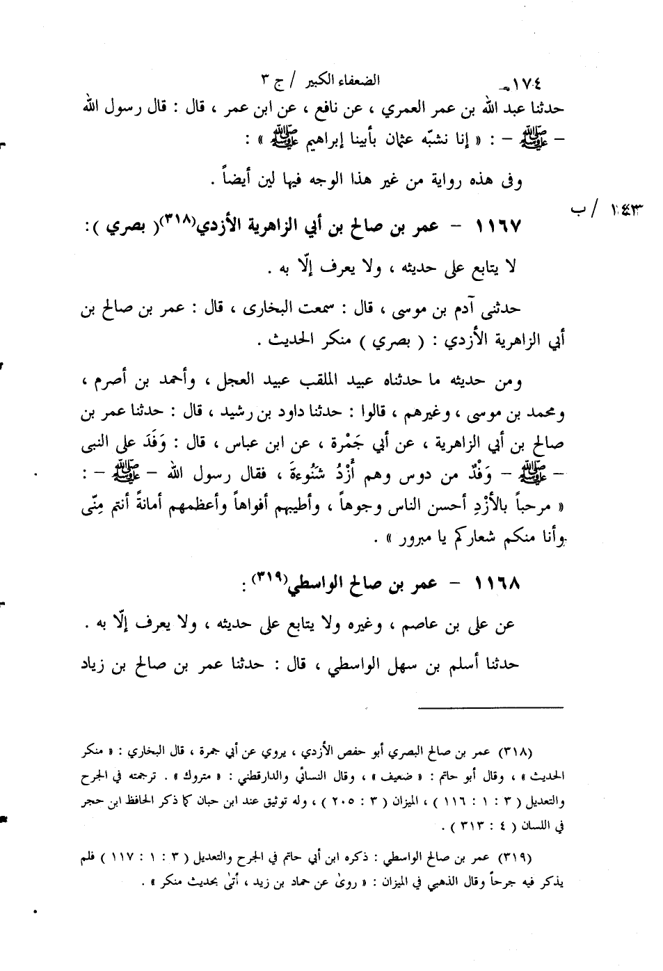 §1167 - عُمَرُ بْنُ صَالِحِ بْنِ أَبِي الزَّاهِرِيَّةِ الْأَزْدِيُّ بَصْرِيٌّ لَا يُتَابَعُ عَلَى حَدِيثِهِ، وَلَا يُعْرَفُ إِلَّا بِهِ. حَدَّثَنِي آدَمُ بْنُ مُوسَى قَالَ: سَمِعْتُ الْبُخَارِيَّ قَالَ: عُمَرُ بْنُ صَالِحِ بْنِ أَبِي الزَّاهِرِيَّةِ الْأَزْدِيُّ بَصْرِيٌّ مُنْكَرُ الْحَدِيثِ