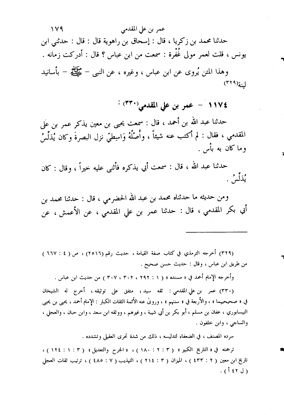 §1174 - عُمَرُ بْنُ عَلِيٍّ الْمُقَدَّمِيُّ حَدَّثَنَا عَبْدُ اللَّهِ بْنُ أَحْمَدَ قَالَ: سَمِعْتُ يَحْيَى بْنَ مَعِينٍ، يَذْكُرُ عُمَرَ بْنَ عَلِيٍّ الْمُقَدَّمِيَّ فَقَالَ: لَمْ أَكْتُبْ عَنْهُ شَيْئًا، وَأَصْلُهُ وَاسِطِيُّ نَزَلَ الْبَصْرَةَ وَكَانَ يُدَلِّسُ، وَمَا كَانَ بِهِ بَأْسٌ حَدَّثَنَا عَبْدُ اللَّهِ قَالَ: سَمِعْتُ أَبِي يَذْكُرُهُ، فَأَثْنَى عَلَيْهِ خَيْرًا وَقَالَ: كَانَ يُدَلِّسُ