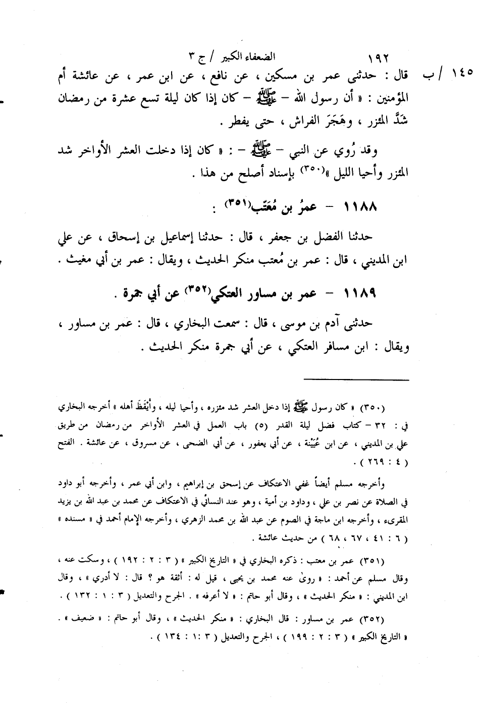 §1189 - عُمَرُ بْنُ مُسَاوِرٍ الْعَتَكِيُّ عَنْ أَبِي جَمْرَةَ. حَدَّثَنِي آدَمُ بْنُ مُوسَى قَالَ: سَمِعْتُ الْبُخَارِيَّ قَالَ: عُمَرُ بْنُ مُسَاوِرٍ وَيُقَالُ ابْنُ مُسَافِرٍ الْعَتَكِيُّ عَنْ أَبِي جَمْرَةَ، مُنْكَرُ الْحَدِيثِ