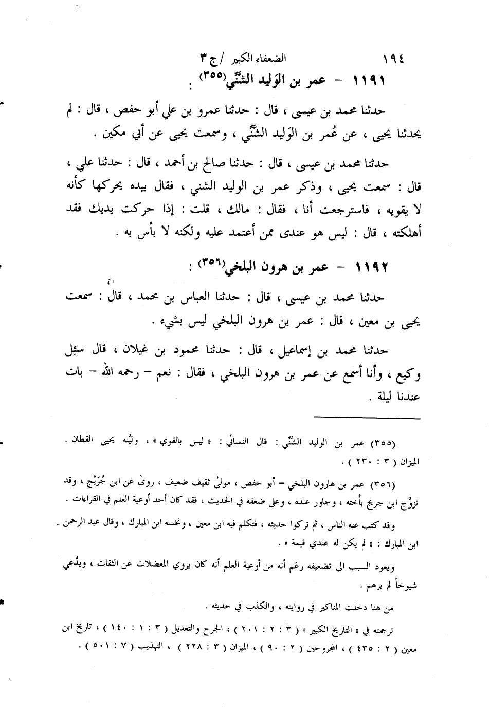 §1192 - عُمَرُ بْنُ هَارُونَ الْبَلْخِيُّ حَدَّثَنَا مُحَمَّدُ بْنُ عِيسَى قَالَ: حَدَّثَنَا الْعَبَّاسُ بْنُ مُحَمَّدٍ قَالَ: سَمِعْتُ يَحْيَى بْنَ مَعِينٍ قَالَ: عُمَرُ بْنُ هَارُونَ الْبَلْخِيُّ لَيْسَ بِشَيْءٍ حَدَّثَنَا مُحَمَّدُ بْنُ إِسْمَاعِيلَ قَالَ: حَدَّثَنَا مَحْمُودُ بْنُ غَيْلَانَ قَالَ: سُئِلَ وَكِيعٌ وَأَنَا أَسْمَعُ، عَنْ عُمَرَ بْنِ هَارُونَ الْبَلْخِيِّ، فَقَالَ: نَعَمْ، رَحِمَهُ اللَّهُ، بَاتَ عِنْدَنَا لَيْلَةً حَدَّثَنَا آدَمُ بْنُ مُوسَى قَالَ: سَمِعْتُ الْبُخَارِيَّ قَالَ: عُمَرُ بْنُ هَارُونَ الْبَلْخِيُّ تَكَلَّمَ فِيهِ يَحْيَى بْنُ مَعِينٍ