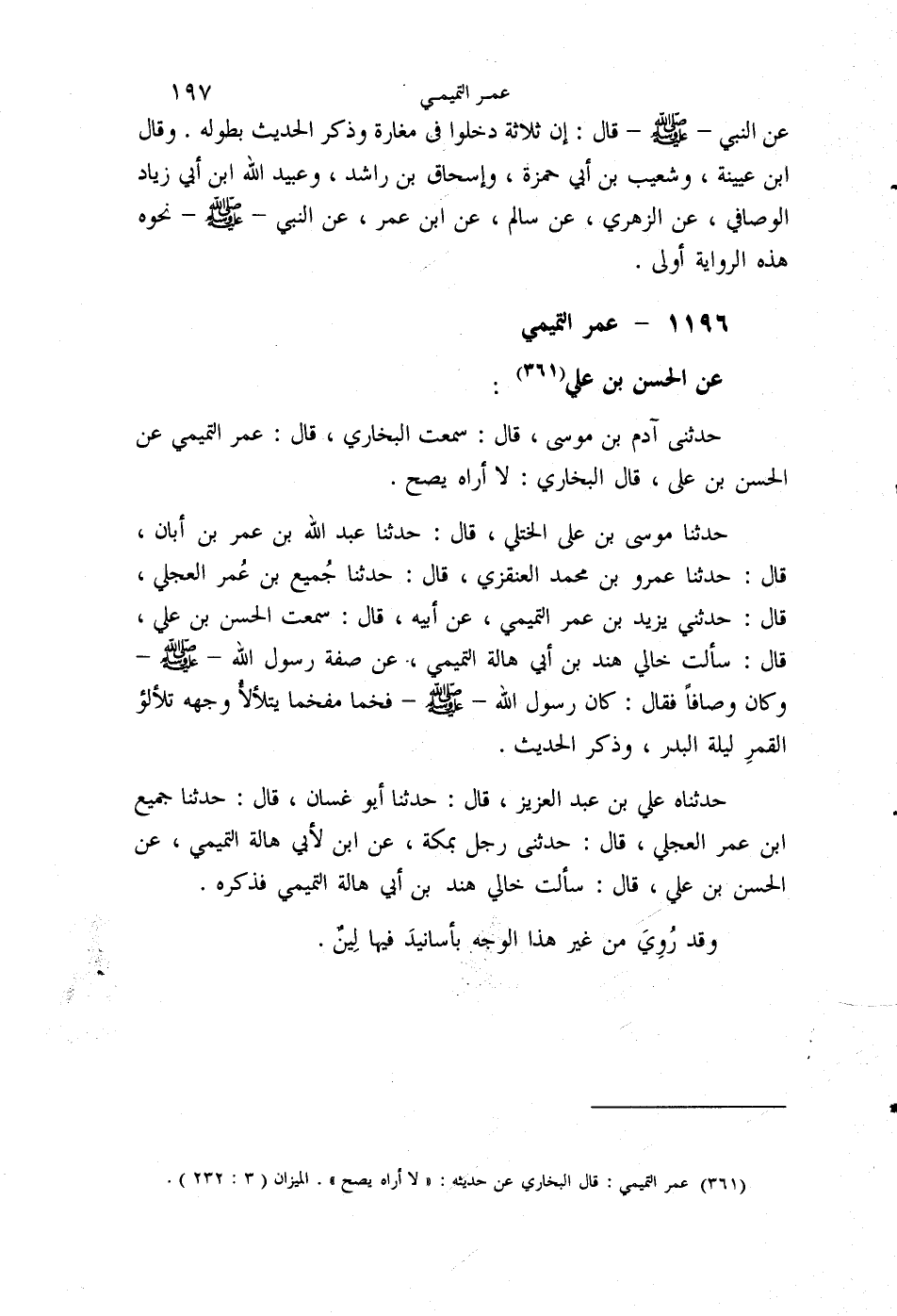 §1196 - عُمَرُ التَّمِيمِيُّ عَنِ الْحَسَنِ بْنِ عَلِيٍّ حَدَّثَنِي آدَمُ بْنُ مُوسَى قَالَ: سَمِعْتُ الْبُخَارِيَّ قَالَ: عُمَرُ التَّمِيمِيُّ عَنِ الْحَسَنِ بْنِ عَلِيٍّ، قَالَ الْبُخَارِيُّ: لَا أُرَاهُ يَصِحُّ
