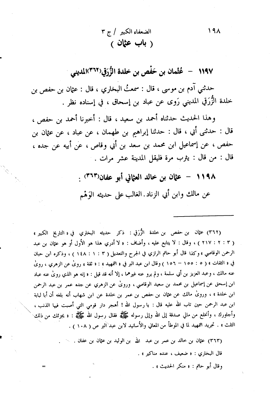 §1197 - عُثْمَانُ بْنُ حَفْصِ بْنِ خَلْدَةَ الزُّرَقِيُّ الْمَدِينِيُّ حَدَّثَنِي آدَمُ بْنُ مُوسَى قَالَ: سَمِعْتُ الْبُخَارِيَّ قَالَ: عُثْمَانُ بْنُ حَفْصِ بْنِ خَلْدَةَ الزُّرَقِيُّ الْمَدِينِيُّ رَوَى عَنْ عَبَّادِ بْنِ إِسْحَاقَ، فِي إِسْنَادِهِ نَظَرٌ
