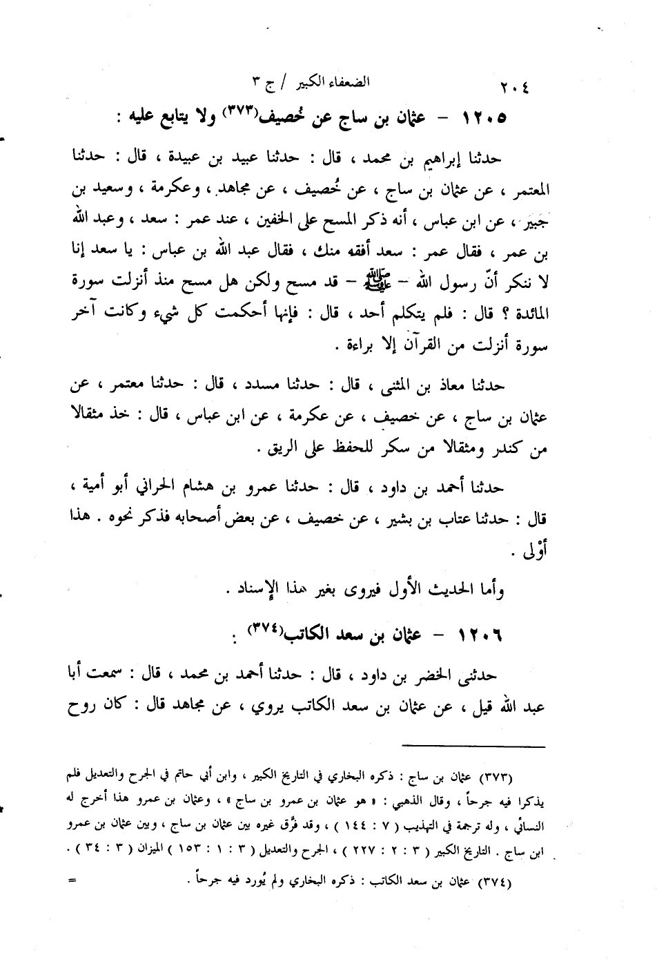 §1206 - عُثْمَانُ بْنُ سَعْدٍ الْكَاتِبُ حَدَّثَنِي الْخَضِرُ بْنُ دَاوُدَ قَالَ: حَدَّثَنَا أَحْمَدُ بْنُ مُحَمَّدٍ قَالَ: سَمِعْتُ أَبَا عَبْدِ اللَّهِ، قِيلَ عَنْ عُثْمَانَ بْنِ سَعْدٍ الْكَاتِبِ، يَرْوِي عَنْ مُجَاهِدٍ قَالَ: كَانَ رَوْحٌ يُكْثِرُ عَنْهُ يُحَدِّثُ عَنْ أَنَسٍ، وَقَدْ حَكَوْا عَنْ يَحْيَى بْنِ سَعِيدٍ الْقَطَّانِ فِيهِ شَيْئًا شَدِيدًا حَدَّثَنَا مُحَمَّدٌ قَالَ: حَدَّثَنَا صَاحٌ قَالَ: حَدَّثَنَا عَلِيٌّ قَالَ: سَمِعْتُ يَحْيَى، يَقُولُ وَذُكِرَ لَهُ عُثْمَانُ بْنُ سَعْدٍ الْكَاتِبُ فَجَعَلَ يَعْجَبُ مِنَ الرِّوَايَةِ عَنْهُ حَدَّثَنَا مُحَمَّدُ بْنُ عِيسَى قَالَ: حَدَّثَنَا عَبَّاسٌ قَالَ: سَمِعْتُ يَحْيَى قَالَ: عُثْمَانُ بْنُ سَعْدٍ الْكَاتِبُ بَصْرِيٌّ لَيْسَ بِذَاكَ