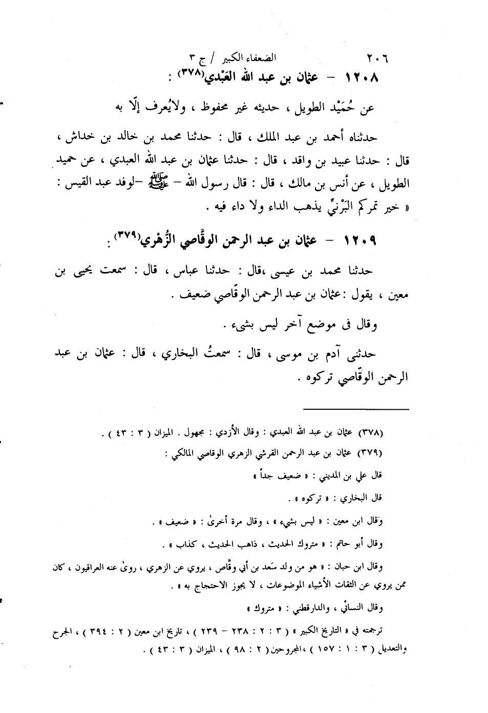 §1209 - عُثْمَانُ بْنُ عَبْدِ الرَّحْمَنِ الْوَقَّاصِيُّ الزُّهْرِيُّ حَدَّثَنَا مُحَمَّدُ بْنُ عِيسَى قَالَ: حَدَّثَنَا عَبَّاسٌ قَالَ: سَمِعْتُ يَحْيَى بْنَ مَعِينٍ يَقُولُ: عُثْمَانُ بْنُ عَبْدِ الرَّحْمَنِ الْوَقَّاصِيُّ ضَعِيفٌ. وَقَالَ فِي مَوْضِعٍ آخَرَ: لَيْسَ بِشَيْءٍ حَدَّثَنِي آدَمُ بْنُ مُوسَى قَالَ: سَمِعْتُ الْبُخَارِيَّ قَالَ: عُثْمَانُ بْنُ عَبْدِ الرَّحْمَنِ الْوَقَّاصِيُّ تَرَكُوهُ