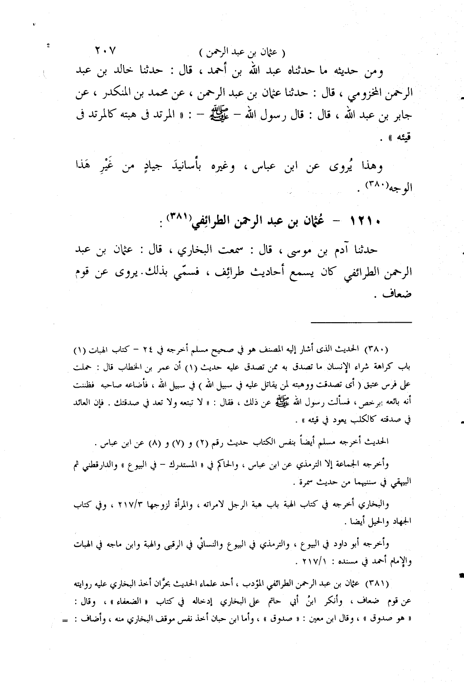 §1210 - عُثْمَانُ بْنُ عَبْدِ الرَّحْمَنِ الطَّرَائِفِيُّ حَدَّثَنَا آدَمُ بْنُ مُوسَى قَالَ: سَمِعْتُ الْبُخَارِيَّ قَالَ: عُثْمَانُ بْنُ عَبْدِ الرَّحْمَنِ الطَّرَائِفِيُّ كَانَ يَسْمَعُ أَحَادِيثَ طَرَائِفَ فَسُمِّيَ بِذَلِكَ، يَرْوِي عَنْ قَوْمٍ ضِعَافٍ