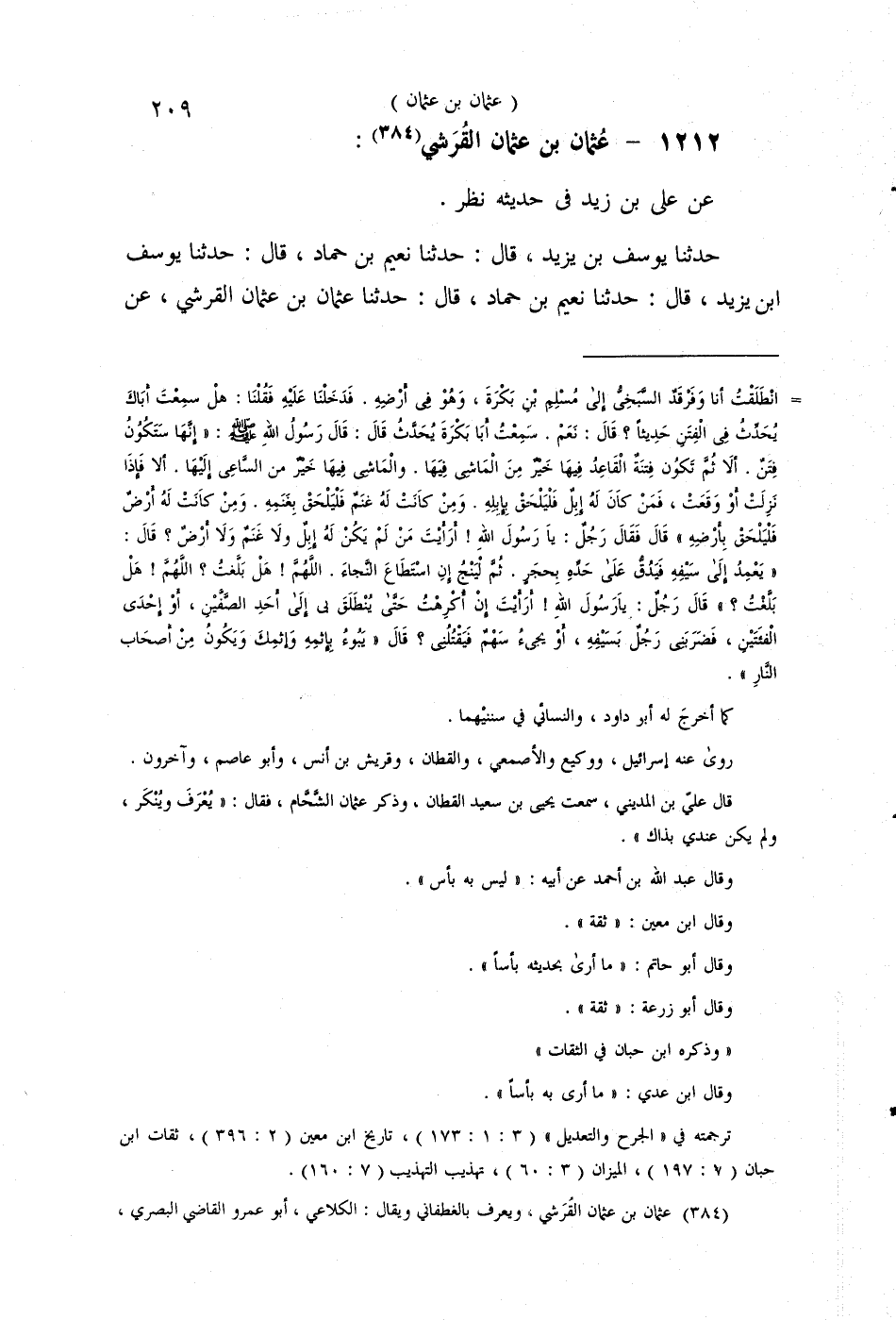§1212 - عُثْمَانُ بْنُ عُثْمَانَ الْقُرَشِيُّ عَنْ عَلِيِّ بْنِ زَيْدٍ، فِي حَدِيثِهِ نَظَرٌ. حَدَّثَنَا يُوسُفُ بْنُ يَزِيدَ قَالَ: حَدَّثَنَا نُعَيْمُ بْنُ حَمَّادٍ قَالَ: حَدَّثَنَا عُثْمَانُ بْنُ عُثْمَانَ الْقُرَشِيُّ، عَنْ عَلِيِّ بْنِ زَيْدٍ قَالَ: سَمِعْتُ سَعِيدَ بْنَ الْمُسَيِّبِ يَقُولُ: لَقَدْ رَأَيْتُ عَلِيًّا وَعُثْمَانَ فِي هَذَا الْمَقْعَدِ يَتَشَاتَمَانِ بِشَيْءٍ لَا أُحَدِّثُ بِهِ أَحَدًا أَبَدًا، ثُمَّ رَأَيْتُهُمَا مِنَ الْعَشِيِّ فِي ذَلِكَ الْمَجْلِسِ يَضْحَكُ أَحَدُهُمَا إِلَى صَاحِبِهِ