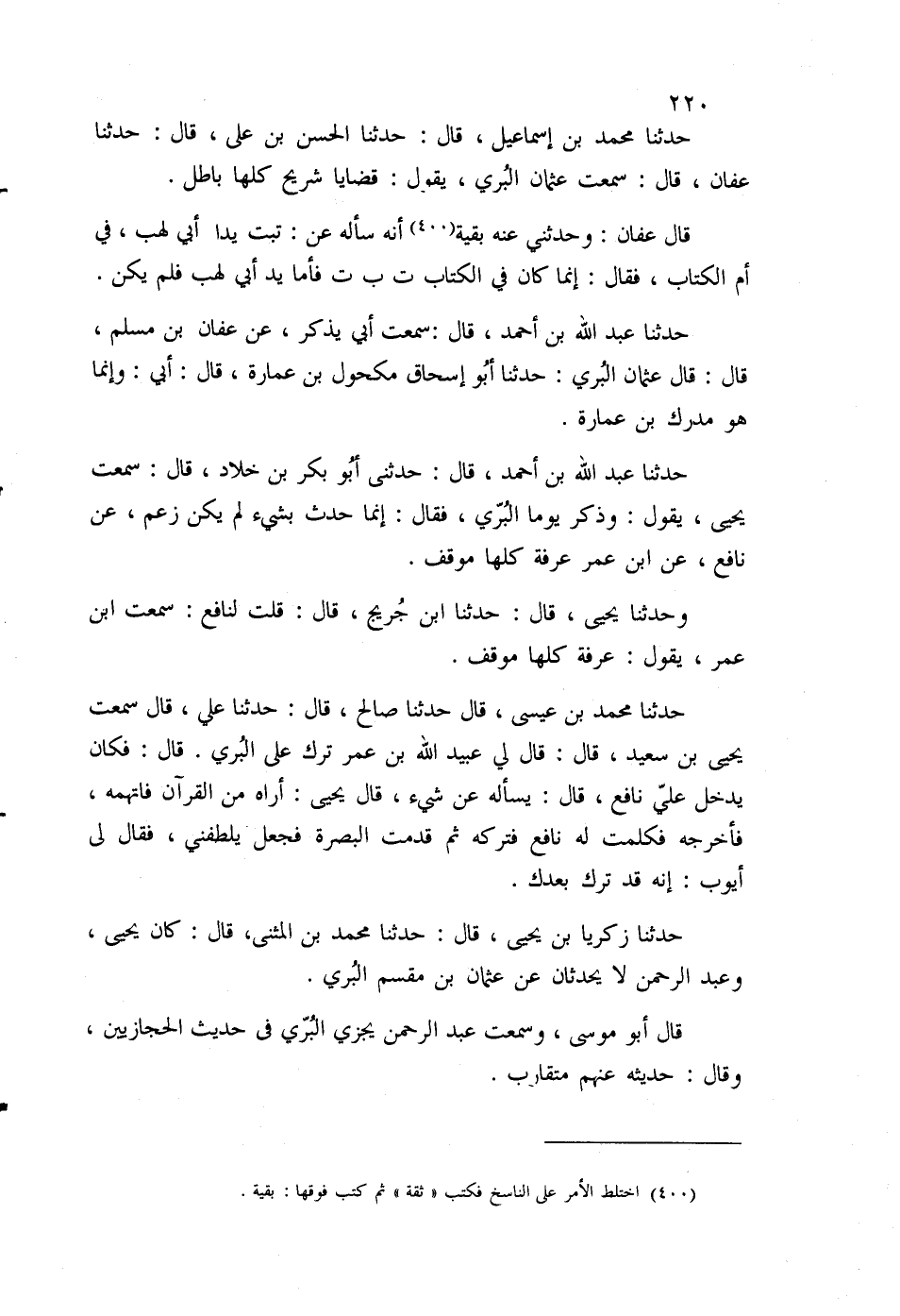 وَحَدَّثَنَا يَحْيَى قَالَ: حَدَّثَنَا ابْنُ جُرَيْجٍ قَالَ: قُلْتُ لِنَافِعٍ: سَمِعْتَ ابْنَ عُمَرَ، يَقُولُ: " §عَرَفَةُ كُلُّهَا مَوْقِفٌ؟ قَالَ: لَا " حَدَّثَنَا مُحَمَّدُ بْنُ عِيسَى قَالَ: حَدَّثَنَا صَالِحٌ قَالَ: حَدَّثَنَا عَلِيٌّ قَالَ: سَمِعْتُ يَحْيَى بْنَ سَعِيدٍ قَالَ: قَالَ لِي عُبَيْدُ اللَّهِ بْنُ عُمَرَ: تَرَكَ عَلِيٌّ الْبُرِّيَّ قَالَ: فَكَانَ يَدْخُلُ عَلَى نَافِعٍ قَالَ: يَسْأَلُهُ عَنْ شَيْءٍ، قَالَ يَحْيَى: أُرَاهُ مِنَ الْقُرْآنِ، فَاتَّهَمَهُ فَأَخْرَجَهُ، فَكَلَّمْتُ لَهُ نَافِعًا فَتَرَكَهُ، ثُمَّ قَدِمْتُ الْبَصْرَةَ فَجَعَلَ يُلَطِّفُنِي، فَقَالَ لِي أَيُّوبُ: إِنَّهُ قَدْ تُرِكَ بَعْدَكَ حَدَّثَنَا زَكَرِيَّا بْنُ يَحْيَى قَالَ: حَدَّثَنَا مُحَمَّدُ بْنُ الْمُثَنَّى قَالَ: كَانَ يَحْيَى وَعَبْدُ الرَّحْمَنِ لَا يُحَدِّثَانِ عَنْ عُثْمَانَ بْنِ مِقْسَمٍ الْبُرِّيِّ قَالَ أَبُو مُوسَى: وَسَمِعْتُ عَبْدَ الرَّحْمَنِ، يَجْزِي الْبُرِّيَّ فِي حَدِيثِ الْحِجَازِيِّينَ، وَقَالَ: حَدِيثُهُ عَنْهُمْ مُتَقَارِبٌ قَالَ أَبُو مُوسَى: وَسَمِعْتُ يَحْيَى بْنَ سَعِيدٍ، أَوْ حَدَّثَ عَنْهُ، أَنَّهُ قَالَ: عَبْدُ الرَّحْمَنِ يَشْتَهِي أَنْ يُحَدِّثَ عَنْهُ، يَعْنِي الْبُرِّيَّ حَدَّثَنَا مُحَمَّدُ بْنُ عِيسَى قَالَ: حَدَّثَنَا الْعَبَّاسُ بْنُ مُحَمَّدٍ قَالَ: سَمِعْتُ يَحْيَى قَالَ: عُثْمَانُ الْبُرِّيُّ لَيْسَ بِشَيْءٍ وَفَى مَوْضِعٍ آخَرَ: عُثْمَانُ بْنُ مِقْسَمٍ ضَعِيفٌ