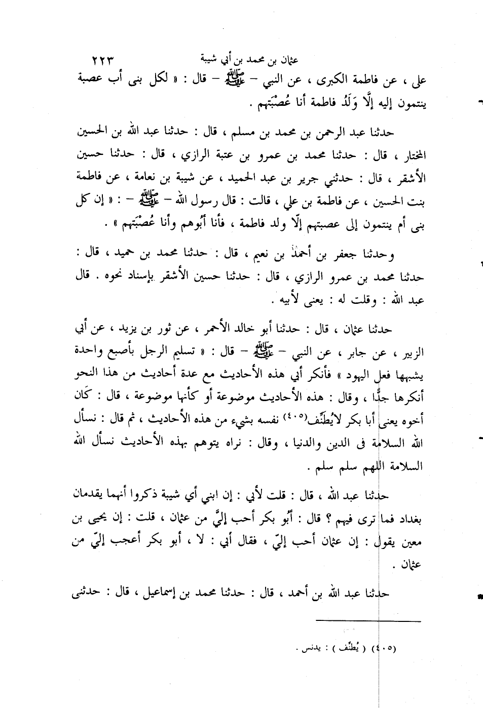 وَحَدَّثَنَا جَعْفَرُ بْنُ أَحْمَدَ بْنِ نُعَيْمٍ قَالَ: حَدَّثَنَا مُحَمَّدُ بْنُ حُمَيْدٍ قَالَ: حَدَّثَنَا مُحَمَّدُ بْنُ عَمْرٍو الرَّازِيُّ قَالَ: حَدَّثَنَا حُسَيْنٌ الْأَشْقَرُ، بِإِسْنَادٍ نَحْوَهُ، قَالَ عَبْدُ اللَّهِ: وَقُلْتُ لَهُ يَعْنِي لِأَبِيهِ: حَدَّثَنَا عُثْمَانُ قَالَ: حَدَّثَنَا أَبُو خَالِدٍ الْأَحْمَرُ عَنْ ثَوْرِ بْنِ يَزِيدَ، عَنْ أَبِي الزُّبَيْرِ، عَنْ جَابِرٍ عَنِ النَّبِيِّ صَلَّى اللهُ عَلَيْهِ وَسَلَّمَ قَالَ: §«تَسْلِيمُ الرَّجُلِ بِأُصْبُعٍ وَاحِدَةٍ يُشْبِهُهَا فِعْلُ الْيَهُودِ» فَأَنْكَرَ أَبِي هَذِهِ الْأَحَادِيثِ مَعَ عِدَّةِ أَحَادِيثَ مِنْ هَذَا النَّحْوِ أَنْكَرَهَا جِدًّا وَقَالَ: هَذِهِ الْأَحَادِيثُ مَوْضُوعَةٌ أَوْ كَأَنَّهَا مَوْضُوعَةٌ، قَالَ: كَانَ أَخُوهُ، يَعْنِي أَبَا بَكْرٍ، لَا يُطَنِّفُ نَفْسَهُ بِشَيْءٍ مِنْ هَذِهِ الْأَحَادِيثِ، ثُمَّ قَالَ: نَسْأَلُ اللَّهَ السَّلَامَةَ فِي الدِّينِ وَالدُّنْيَا، وَقَالَ: نَرَاهُ يَتَوَهَّمُ بِهَذِهِ الْأَحَادِيثِ، نَسْأَلُ اللَّهَ السَّلَامَةَ، اللَّهُمَّ سَلِّمْ سَلِّمْ حَدَّثَنَا عَبْدُ اللَّهِ قَالَ: قُلْتُ لِأَبِي: إِنَّ ابْنَيْ أَبِي شَيْبَةَ ذَكَرُوا أَنَّهُمَا يَقْدَمَانِ بَغْدَادَ، فَمَا تَرَى فِيهِمْ؟ قَالَ: أَبُو بَكْرٍ أَحَبُّ إِلَيَّ مِنْ عُثْمَانَ، قُلْتُ: إِنَّ يَحْيَى بْنَ مَعِينٍ يَقُولُ: إِنَّ عُثْمَانَ أَحَبُّ إِلَيَّ، فَقَالَ أَبِي: لَا، أَبُو بَكْرٍ أَعْجَبُ إِلَيَّ مِنْ عُثْمَانَ حَدَّثَنَا عَبْدُ اللَّهِ بْنُ أَحْمَدَ قَالَ: حَدَّثَنَا مُحَمَّدُ بْنُ إِسْمَاعِيلَ قَالَ: حَدَّثَنِي بَعْضُ أَصْحَابِنَا قَالَ: قُلْتُ لِأَحْمَدَ بْنِ حَنْبَلٍ: مَاتَ عُثْمَانُ بْنُ أَبِي شَيْبَةَ قَالَ: مَاتَ أَبُو جَعْفَرٍ الْجَمَّالُ، رَحِمَهُ اللَّهُ