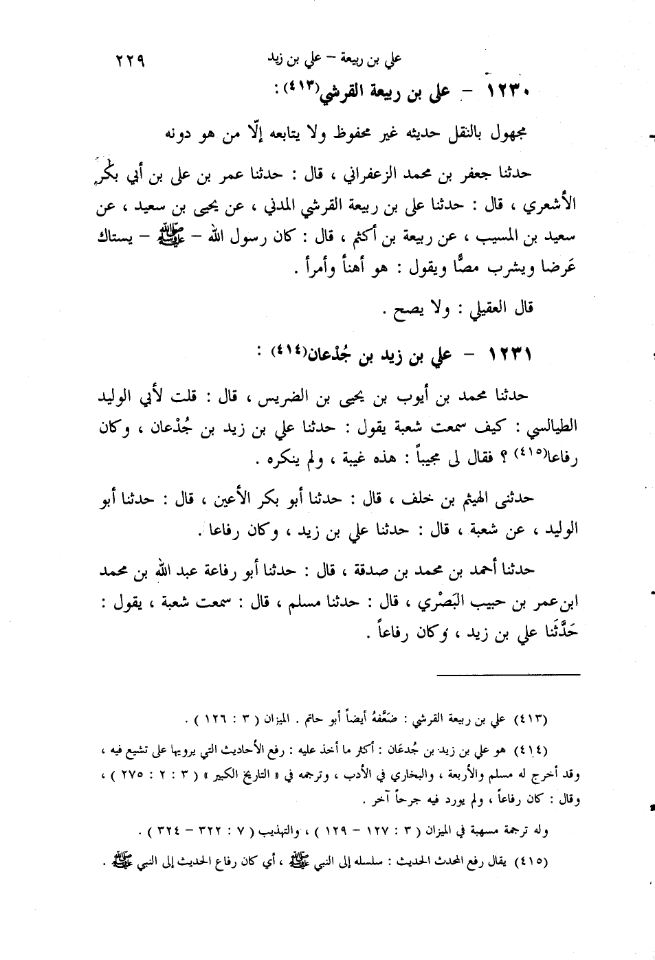 §1231 - عَلِيُّ بْنُ زَيْدِ بْنِ جُدْعَانَ حَدَّثَنَا مُحَمَّدُ بْنُ أَيُّوبَ بْنِ يَحْيَى بْنِ الضُّرَيْسِ قَالَ: قُلْتُ لِأَبِي الْوَلِيدِ الطَّيَالِسِيِّ: كَيْفَ سَمِعْتَ شُعْبَةَ يَقُولُ: حَدَّثَنَا عَلِيُّ بْنُ زَيْدِ بْنِ جُدْعَانَ وَكَانَ رَفَّاعًا؟ فَقَالَ لِي مُجِيبًا: هَذِهِ غِيبَةٌ، وَلَمْ يُنْكِرْهُ حَدَّثَنِي الْهَيْثَمُ بْنُ خَلَفٍ قَالَ: حَدَّثَنَا أَبُو بَكْرٍ الْأَعْيَنُ قَالَ: حَدَّثَنَا أَبُو الْوَلِيدِ، عَنْ شُعْبَةَ قَالَ: حَدَّثَنَا عَلِيُّ بْنُ زَيْدٍ، وَكَانَ رَفَّاعًا حَدَّثَنَا أَحْمَدُ بْنُ مُحَمَّدِ بْنِ صَدَقَةَ قَالَ: حَدَّثَنَا أَبُو رِفَاعَةَ عَبْدُ اللَّهِ بْنُ مُحَمَّدِ بْنِ عُمَرَ بْنِ حَبِيبٍ الْبَصْرِيُّ قَالَ: حَدَّثَنَا مُسْلِمٌ قَالَ: سَمِعْتُ شُعْبَةَ يَقُولُ: حَدَّثَنَا عَلِيُّ بْنُ زَيْدٍ، وَكَانَ رَفَّاعًا -[230]- حَدَّثَنَا عَبْدُ اللَّهِ بْنُ أَحْمَدَ قَالَ: حَدَّثَنَا أَبُو بَكْرِ بْنُ خَلَّادٍ قَالَ: سَمِعْتُ يَحْيَى بْنَ سَعِيدٍ يَقُولُ: سَمِعْتُ شُعْبَةَ يَقُولُ: حَدَّثَنَا عَلِيُّ بْنُ زَيْدٍ، وَكَانَ رَفَّاعًا حَدَّثَنَا عَبْدُ اللَّهِ بْنُ أَحْمَدَ بْنِ عَبْدِ السَّلَامِ قَالَ: حَدَّثَنَا أَحْمَدُ بْنُ سَعِيدٍ الدَّارِمِيُّ قَالَ: حَدَّثَنَا عَبْدُ الصَّمَدِ قَالَ: حَدَّثَنَا شُعْبَةُ قَالَ: حَدَّثَنَا عَلِيُّ بْنُ زَيْدٍ، وَكَانَ رَفَّاعًا حَدَّثَنَا أَحْمَدُ بْنُ أَصْرَمَ الْمُزَنِيُّ قَالَ: حَدَّثَنَا أَبُو مَعْمَرٍ قَالَ: كَانَ ابْنُ عُيَيْنَةَ يُضَعِّفُ ابْنَ عَقِيلٍ وَعَاصِمَ بْنَ عُبَيْدِ اللَّهِ وَعَلِيَّ بْنَ زَيْدِ بْنِ جُدْعَانَ حَدَّثَنَا هَيْثَمُ بْنُ خَلَفٍ قَالَ:، حَدَّثَنَا أَبُو بَكْرٍ الْأَعْيَنُ قَالَ: حَدَّثَنَا سُلَيْمَانُ بْنُ حَرْبٍ قَالَ: حَدَّثَنَا حَمَّادُ بْنُ زَيْدٍ قَالَ: حَدَّثَنَا عَلِيُّ بْنُ زَيْدٍ، وَكَانَ يَقْلِبُ الْأَحَادِيثَ حَدَّثَنَا عَبْدُ اللَّهِ بْنُ أَحْمَدَ قَالَ: حَدَّثَنِي عُبَيْدُ اللَّهِ بْنُ مُعَاذٍ قَالَ: حَدَّثَنِي أَبِي، عَنْ شُعْبَةَ، عَنْ عَلِيِّ بْنِ زَيْدٍ، قَبْلَ أَنْ يَخْتَلِطَ حَدَّثَنِي عَلِيُّ بْنُ عَبْدِ الصَّمَدِ قَالَ: حَدَّثَنَا أَبُو مَعْمَرٍ قَالَ: قَالَ سُفْيَانُ: كَتَبْتُ عَنْ عَلِيِّ بْنِ زَيْدٍ، كِتَابًا كَبِيرًا فَتَرَكْتُهُ زُهْدًا فِيهِ حَدَّثَنَا مُحَمَّدُ بْنُ عِيسَى قَالَ: حَدَّثَنَا صَالِحٌ قَالَ: حَدَّثَنَا عَلِيٌّ قَالَ: سَمِعْتُ سُفْيَانَ يَقُولُ: وَهَبْتُ لِابْنِ أَخِي عَمْرٍو كِتَابَ ابْنِ جُدْعَانَ فَقِيلَ لِسُفْيَانَ: لِمَ وَهَبْتَهُ؟ قَالَ: كُنْتُ قَدْ حَفِظْتُهُ وَلَمْ أَرَ أَنِّي أَنْسَاهُ، قَالَ سُفْيَانُ: وَكُنْتُ أُرِيدُ أَهْزَأُ مِنْهُ، وَقَالَ بِيَدِهِ يَقُولُ: أَثْبَتُ مِنْهُ، وَجَمَعَ يَدَهُ حَدَّثَنَا مُحَمَّدُ بْنُ عِيسَى قَالَ: حَدَّثَنَا صَالِحٌ قَالَ: حَدَّثَنَا عَلِيٌّ قَالَ: سَمِعَ سُفْيَانَ، ح وَحَدَّثَنَا مُحَمَّدُ بْنُ إِسْمَاعِيلَ قَالَ: حَدَّثَنَا الْحَسَنُ بْنُ عَلِيٍّ قَالَ: حَدَّثَنَا أَبُو مُسْلِمٍ الْمُسْتَمْلِيُّ قَالَ: حَدَّثَنَا سُفْيَانُ قَالَ: قَالَ ابْنُ جُدْعَانَ لِعَمَّارٍ الدُّهْنِيِّ وَسَالِمِ بْنِ أَبِي حَفْصَةَ، قَالَ سُفْيَانُ: وَكَانَ مَذْهَبُهُمْ وَاحِدًا، فَقَالَ لَهُمْ: أَخْبِرُونِي وَلَا تَكْتُمُونِي، وَلَوْ كَانَ فِي جَسَدِي بَرَصٌ لَأَخْبَرْتُكُمْ بِهِ حَدَّثَنَا مُحَمَّدُ بْنُ عِيسَى قَالَ: حَدَّثَنَا عُمَرُ بْنُ عَلِيٍّ قَالَ: كَانَ يَحْيَى يَتَّقِي الْحَدِيثَ عَنْ عَلِيِّ بْنِ زَيْدٍ، فَسَأَلْتُهُ مَرَّةً عَنْ حَدِيثِ حَمَّادِ بْنِ سَلَمَةَ، عَنْ عَلِيِّ بْنِ زَيْدٍ، عَنْ عُقْبَةَ بْنِ صِئْبَانَ، عَنْ أَبِي بَكْرَةَ، عَنِ النَّبِيِّ صَلَّى اللهُ عَلَيْهِ وَسَلَّمَ فِي قَوْلِهِ: مِنَ ا