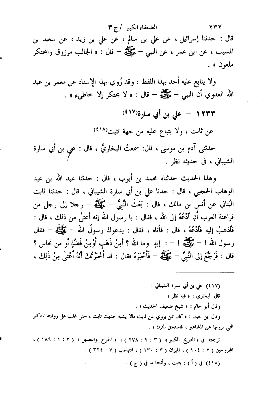 §1233 - عَلِيُّ بْنُ أَبِي سَارَةَ عَنْ ثَابِتٍ، وَلَا يُتَابَعُ عَلَيْهِ مِنْ جِهَةٍ تَثْبُتُ. حَدَّثَنِي آدَمُ بْنُ مُوسَى قَالَ: سَمِعْتُ الْبُخَارِيَّ قَالَ: عَلِيُّ بْنُ أَبِي سَارَةَ الشَّيْبَانِيُّ فِي حَدِيثِهِ نَظَرٌ